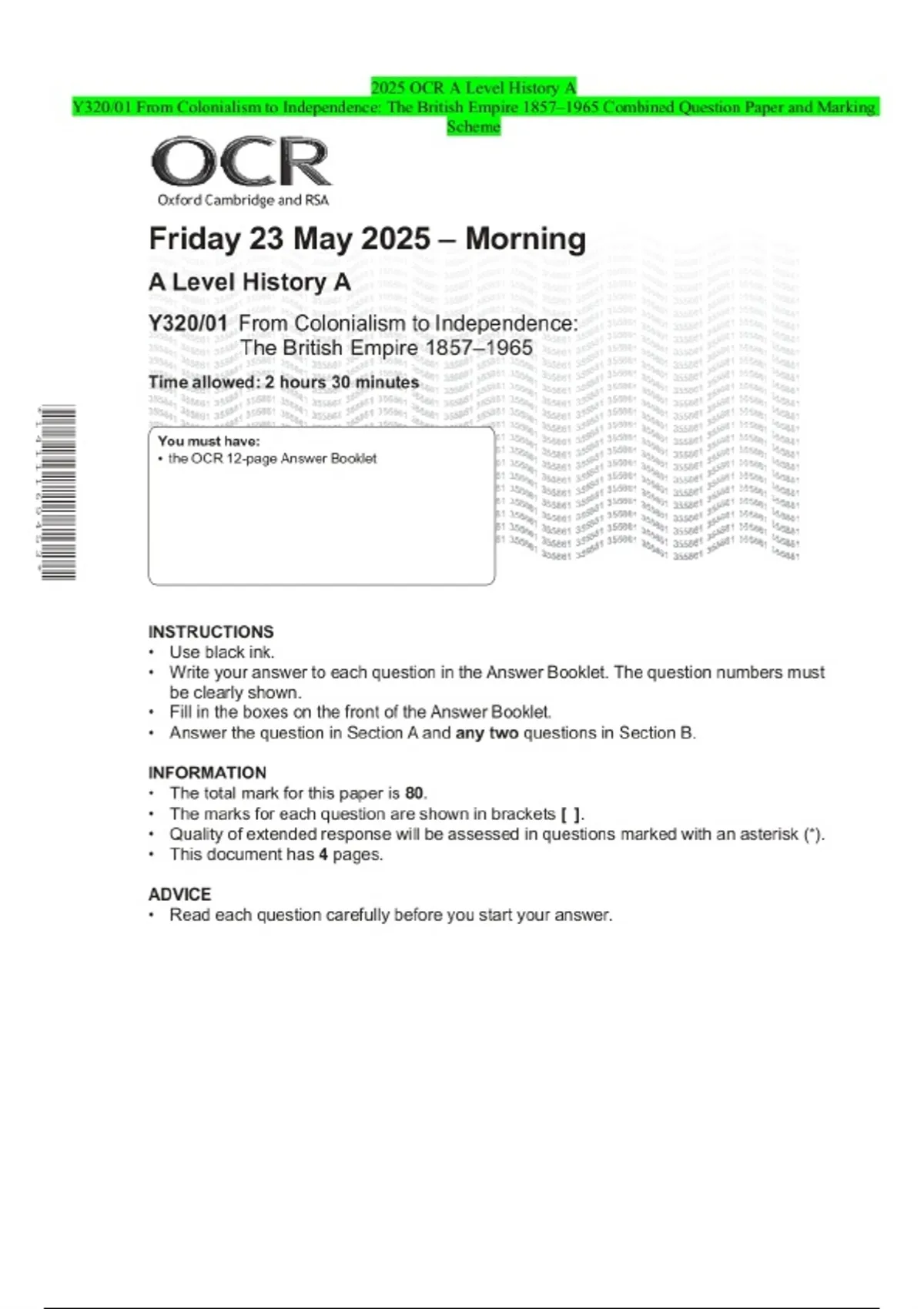 2025 OCR A Level History A Y320/01 From Colonialism to Independence: The British Empire 1857–1965 Combined Question Paper and Marking Scheme