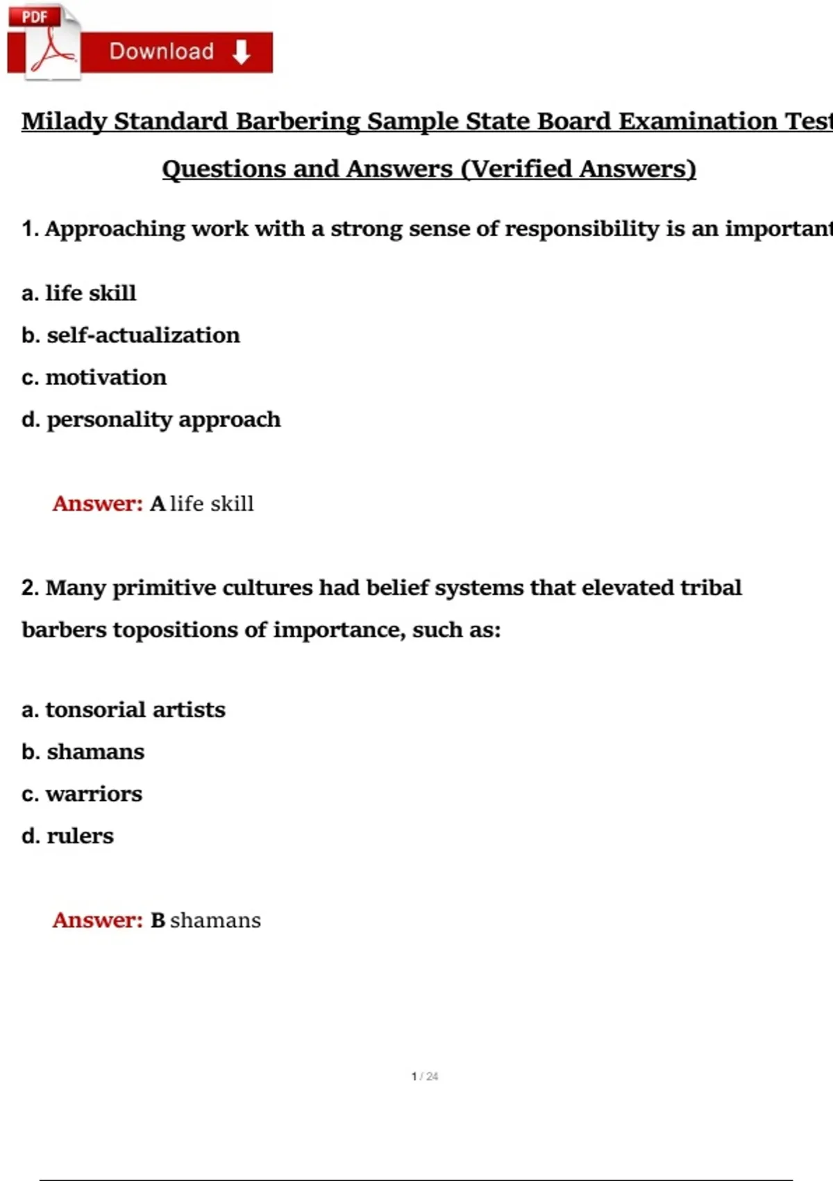 Milady Standard Barbering – Sample State Board Examination Test 1 (6th Edition) | Verified Practice Questions & Answers