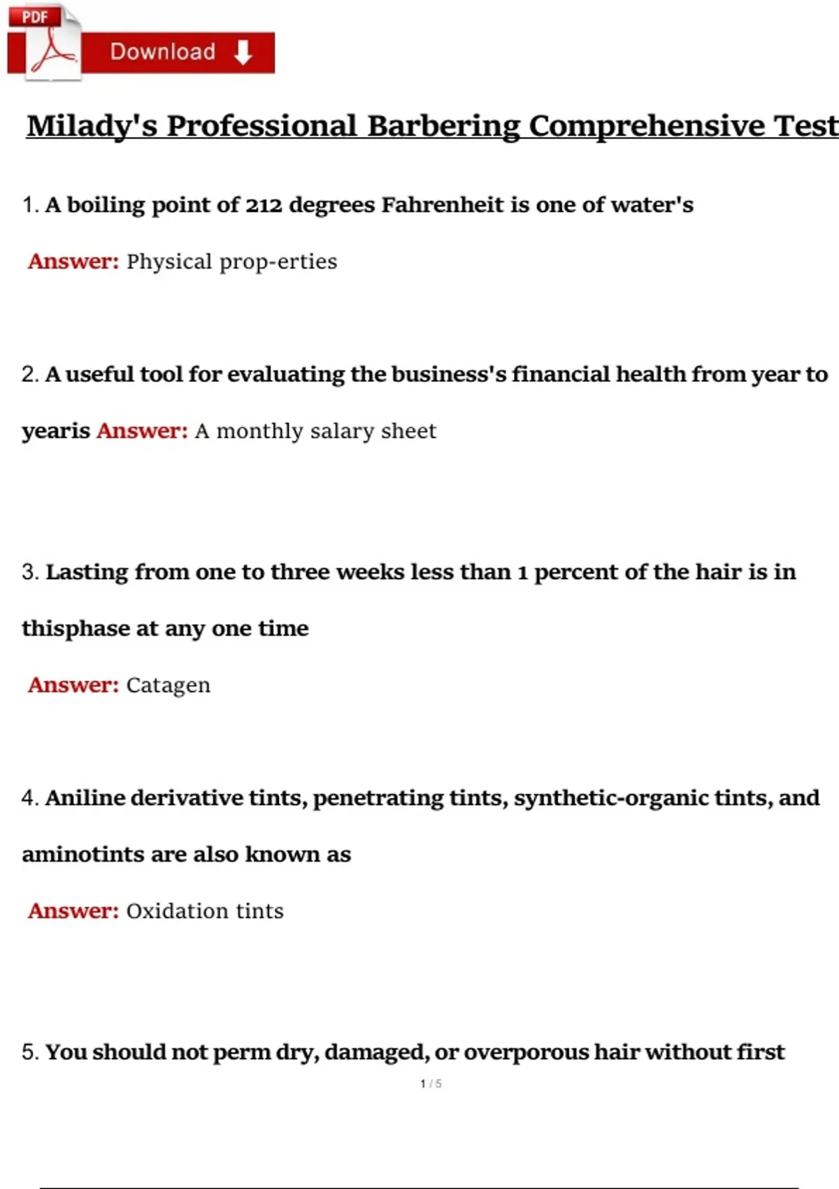 Master your barber licensing preparation with this Milady’s Professional Barbering Comprehensive Test, designed to fully reflect the content, difficulty, and structure of the actual state board exam. This all-inclusive resource provides complete exam-style questions paired with verified correct answers, helping you study smarter, improve accuracy, and build confidence before test day. Ideal for barber students, apprentices, instructors, and professionals seeking a thorough, high-quality, exam-focused review. What’s Included Full comprehensive test covering all major Milady barbering domains Realistic, state board–style multiple-choice questions Verified correct answers for reliable self-assessment Covers theory, practical knowledge, safety, sanitation & chemical services Designed to strengthen your understanding and exam readiness Suitable for both beginners and advanced candidates