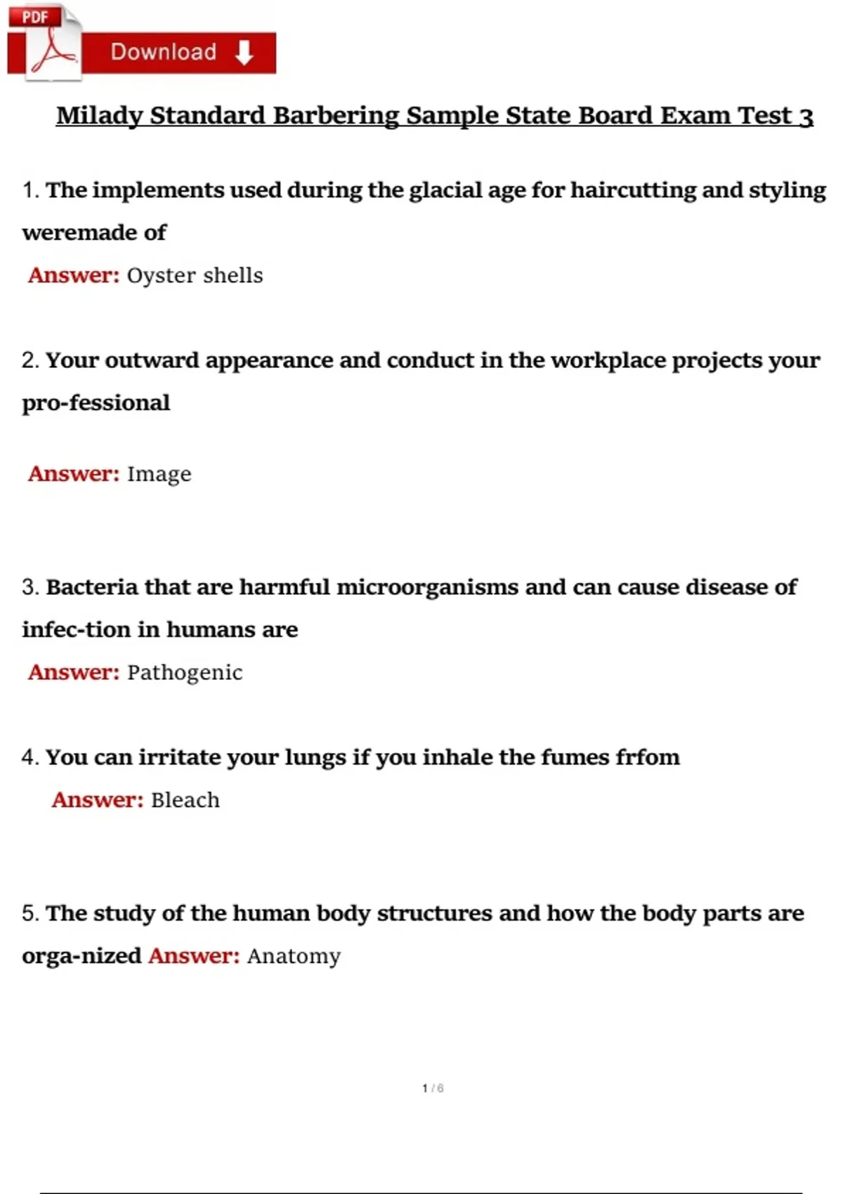 Boost your confidence and exam readiness with this Milady Standard Barbering Sample State Board Exam Test 3, designed to replicate the real format, difficulty, and content of the barber written licensing exam. This resource includes authentic, exam-style multiple-choice questions with verified correct answers, based on the Milady Standard Barbering curriculum. Perfect for barber students, apprentices, and professionals preparing for state board certification. What’s Inside Full Sample State Board Exam Test 3 Based on Milady Standard Barbering Exam-style multiple-choice questions Verified correct answers for accuracy Covers theory, practical skills, sanitation, chemistry & more Ideal for exam prep, classroom use, or self-study