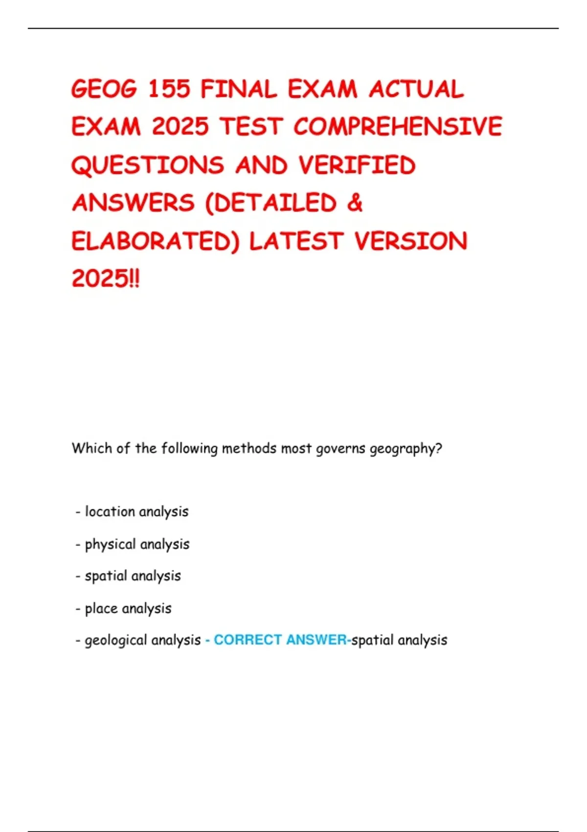 GEOG 155 FINAL EXAM ACTUAL EXAM 2025 TEST COMPREHENSIVE QUESTIONS AND VERIFIED ANSWERS (DETAILED & ELABORATED) LATEST VERSION 2025!!