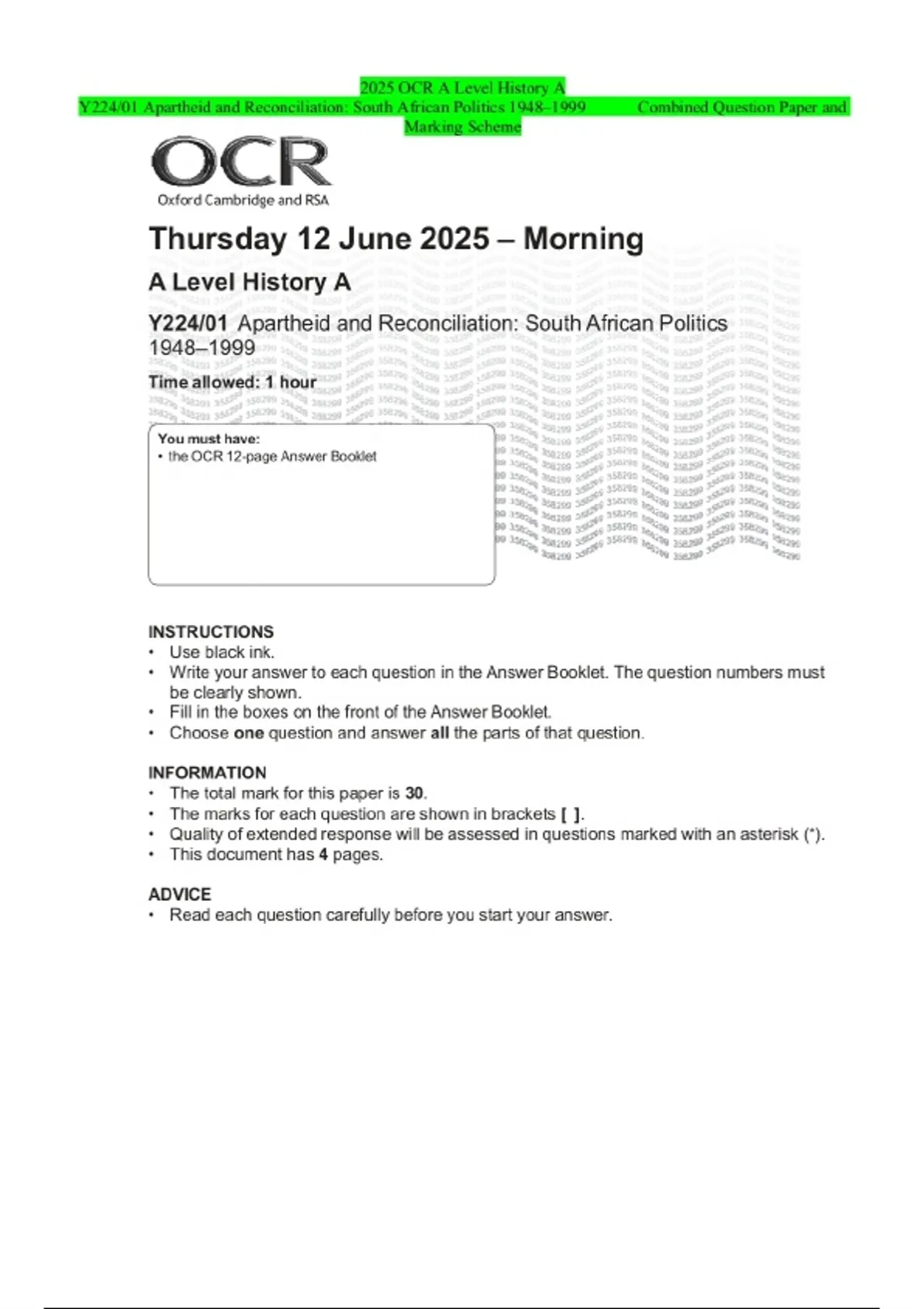 2025 OCR A Level History A Y224/01 Apartheid and Reconciliation: South African Politics 1948–1999 Combined Question Paper and Marking Scheme