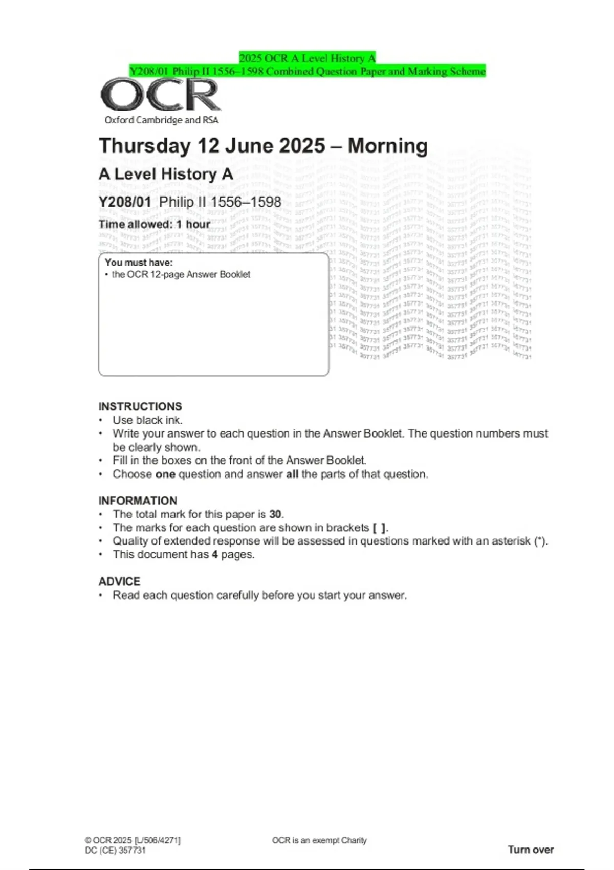 2025 OCR A Level History A Y208/01 Philip II 1556–1598 Combined Question Paper and Marking Scheme