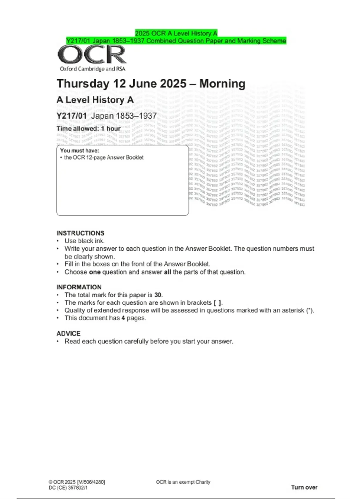 2025 OCR A Level History A Y217/01 Japan 1853–1937 Combined Question Paper and Marking Scheme