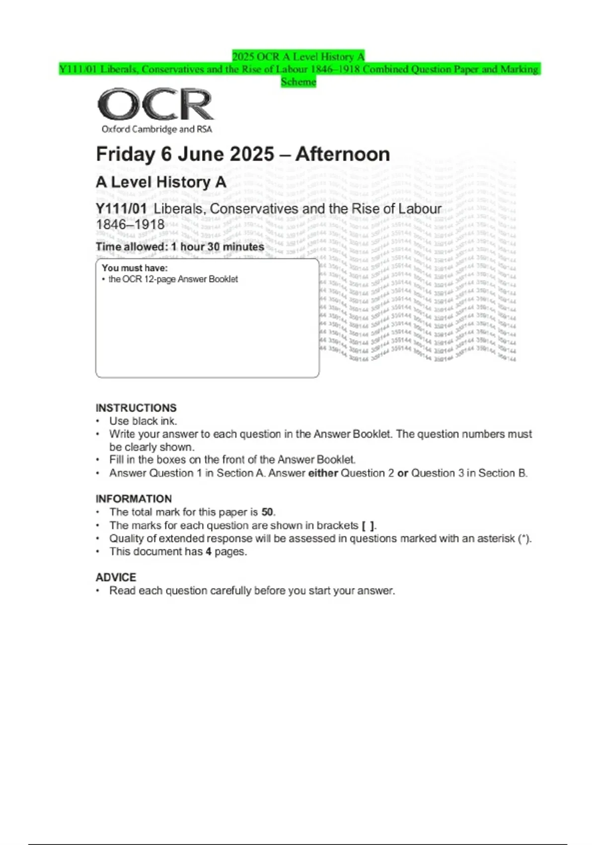 2025 OCR A Level History A Y111/01 Liberals, Conservatives and the Rise of Labour 1846–1918 Combined Question Paper and Marking Scheme