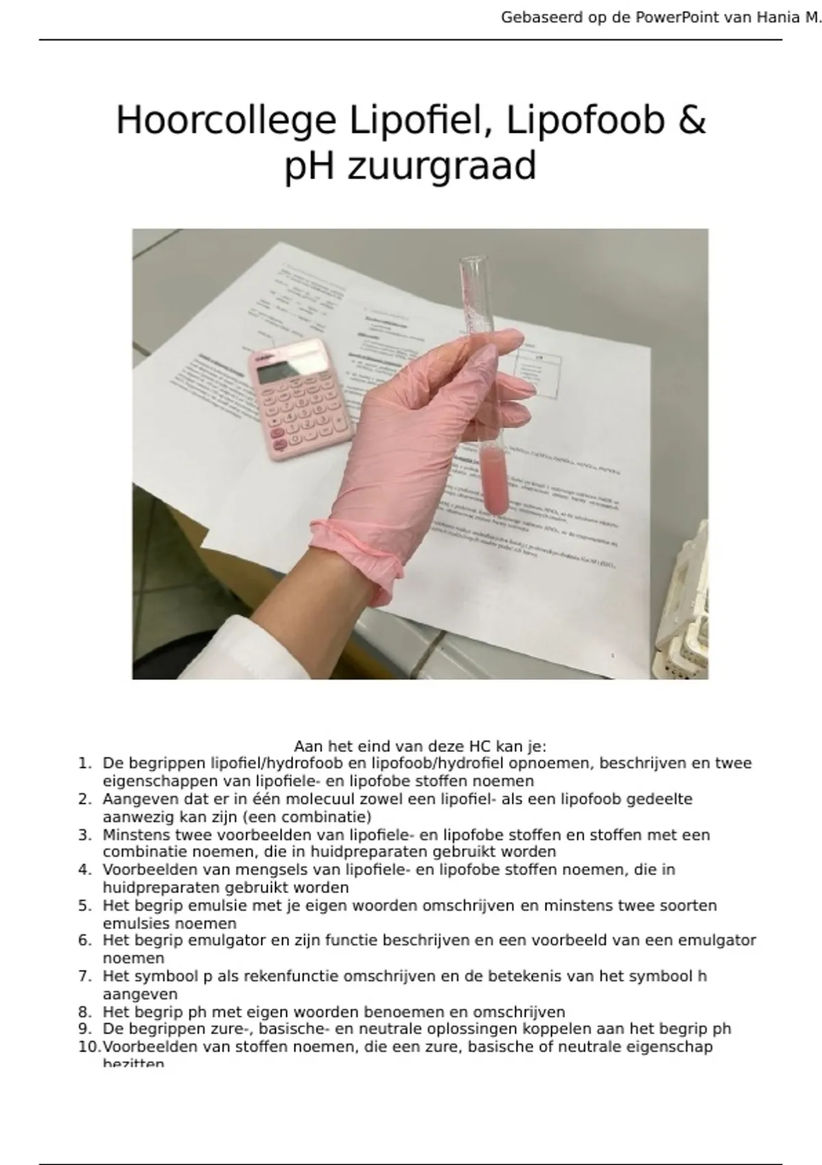Samenvatting Hoorcollege Lipofiel, Lipofoob & pH zuurgraad