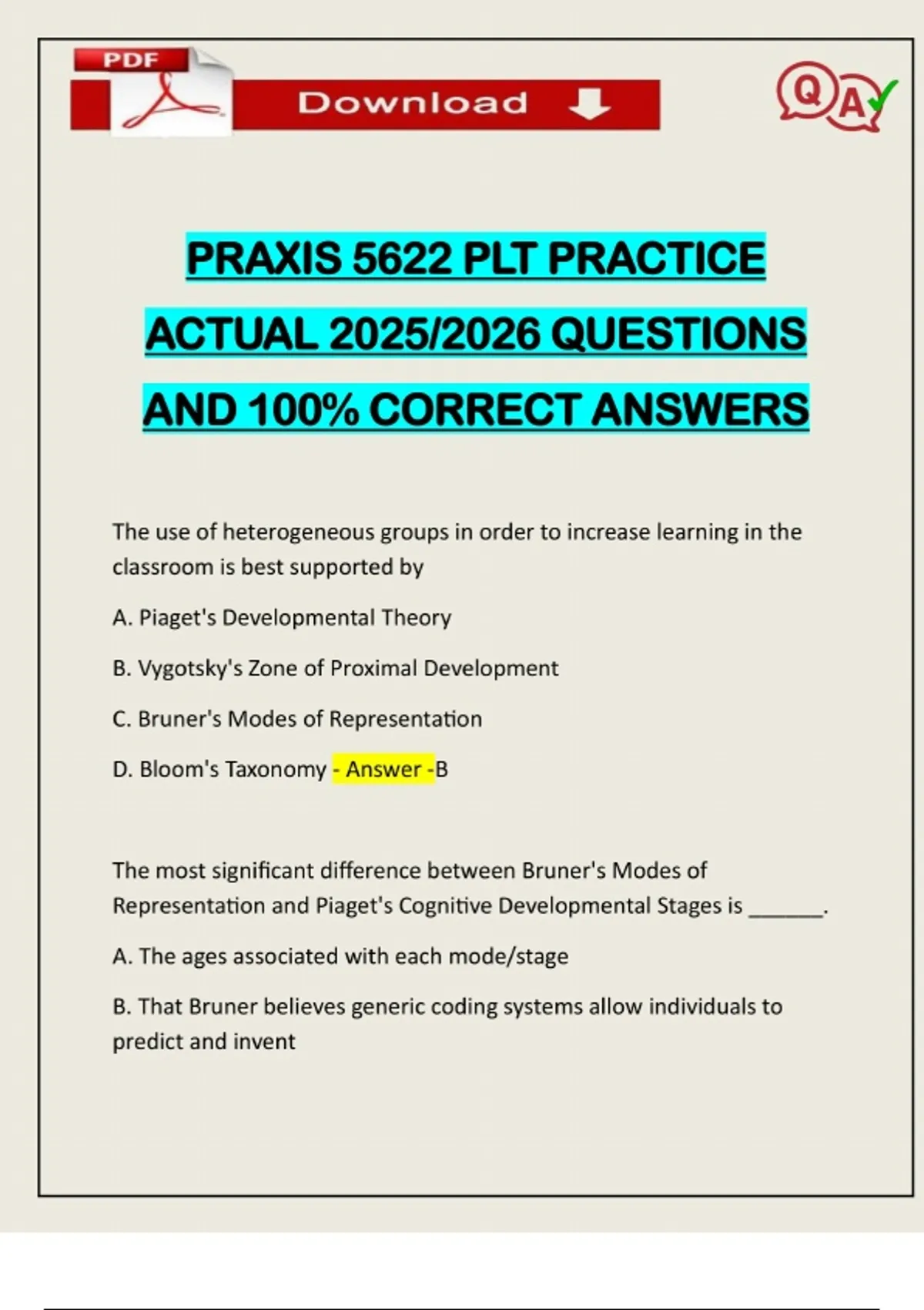 PRAXIS 5622 PLT PRACTICE ACTUAL 2025/2026 QUESTIONS AND 100% CORRECT ANSWERS The use of heterogeneous groups in order to increase learning in the classroom is best supported by A. Piaget's Developmental Theory B. Vygotsky's Zone of Proximal Development C. Bruner's Modes of Representation D. Bloom's Taxonomy - Answer -B The most significant difference between Bruner's Modes of Representation and Piaget's Cognitive Developmental Stages is ______. A. The ages associated with each mode/stage B. That Bruner believes generic coding systems allow individuals to predict and inventNeed assistance on Online classes, Exams & Assignments? Reach out for instant help!! Full Course Assistance, Plagiarism-free Essay Writing, Research Paper, Dissertation, Discussion Posts, etc…. Confidential & Secure services. Tutors are available for all subjects! Email now at: C. That Piaget suggests we learn through assimilation and accommodation D. That Bruner believes an individual is capable of learning any concept at any age as long as it is presented and organized appropriately - Answer -D Eight year old Nathan has been failing to reach the class goal of 30 addition facts answered cor