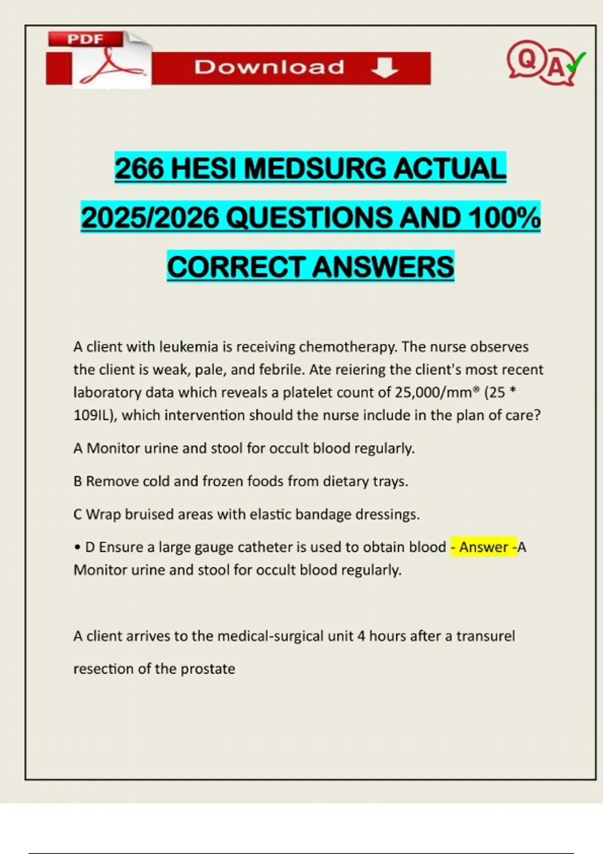 266 HESI MEDSURG ACTUAL 2025/2026 QUESTIONS AND 100% CORRECT ANSWERS A client with leukemia is receiving chemotherapy. The nurse observes the client is weak, pale, and febrile. Ate reiering the client's most recent laboratory data which reveals a platelet count of 25,000/mm® (25 * 109IL), which intervention should the nurse include in the plan of care? A Monitor urine and stool for occult blood regularly. B Remove cold and frozen foods from dietary trays. C Wrap bruised areas with elastic bandage dressings. • D Ensure a large gauge catheter is used to obtain blood - Answer -A Monitor urine and stool for occult blood regularly. A client arrives to the medical-
