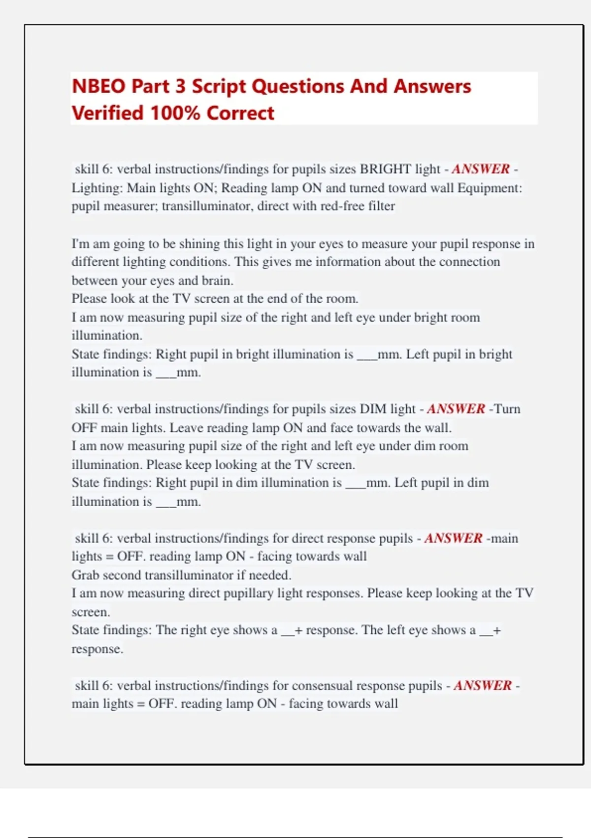 skill 6: verbal instructions/findings for direct response pupils - ANSWER -main