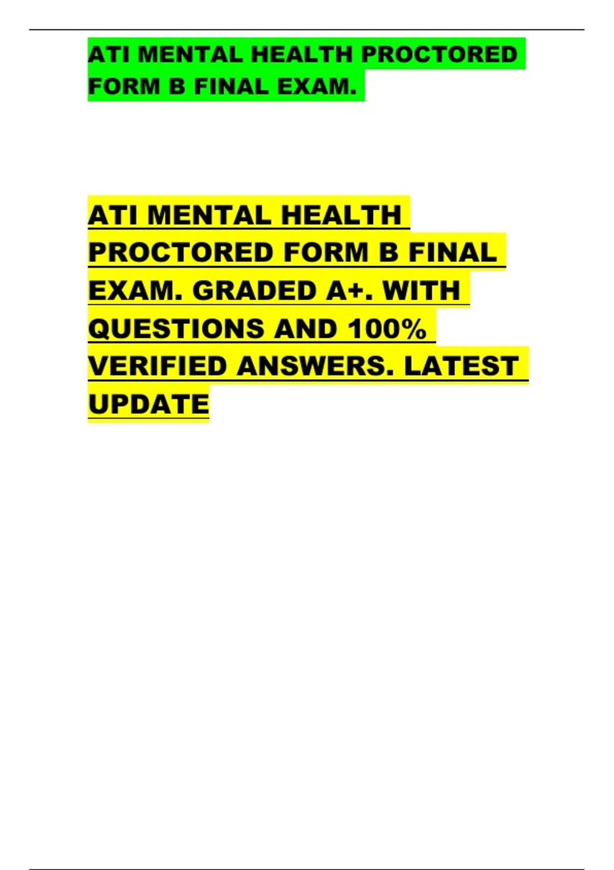 ATI MENTAL HEALTH PROCTORED FORM B FINAL EXAM. ATI MENTAL HEALTH PROCTORED FORM B FINAL EXAM. GRADED A+. WITH QUESTIONS AND 100% VERIFIED ANSWERS. LATEST UPDATE