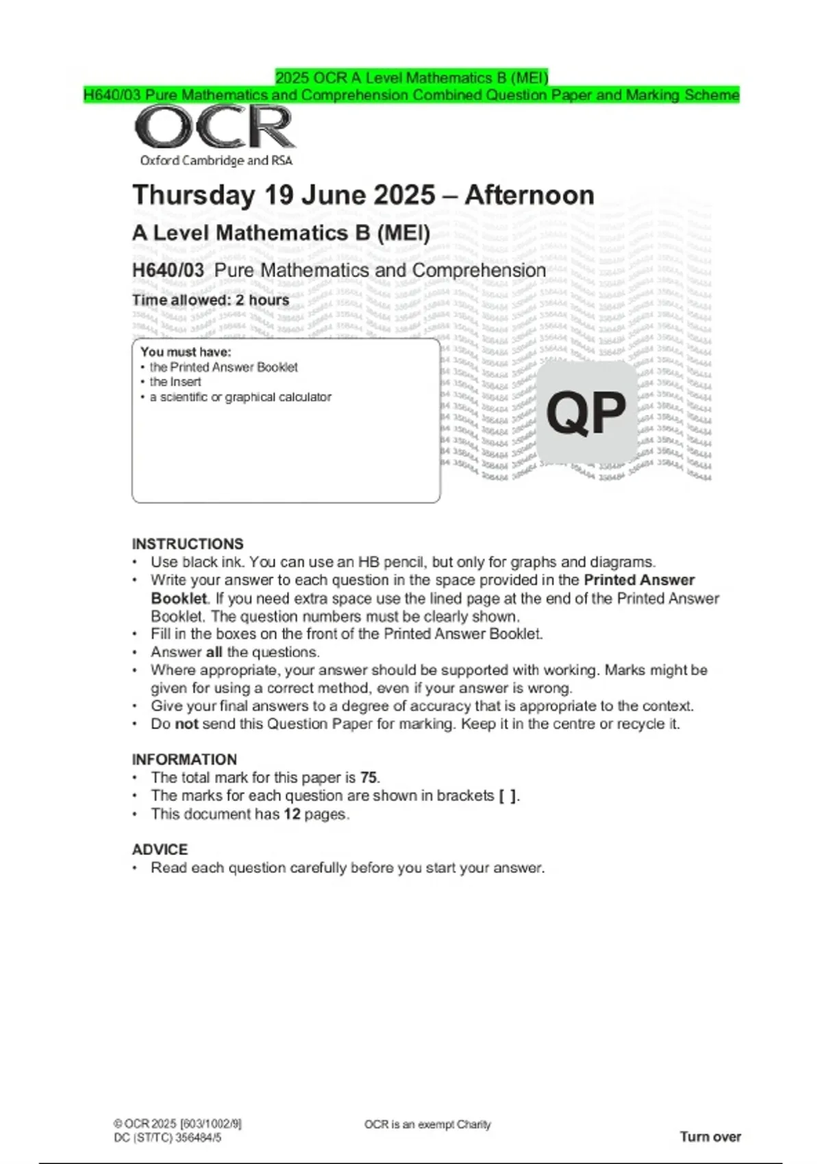 2025 OCR A Level Mathematics B (MEI) H640/03 Pure Mathematics and Comprehension Combined Question Paper and Marking Scheme