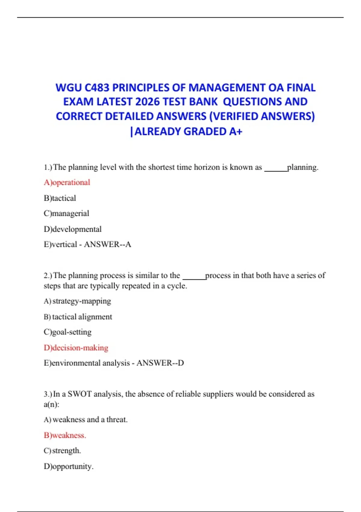 This document covers the fully updated 2026 WGU C483 Principles of Management Objective Assessment test bank, including verified exam-style questions with correct, detailed answers. It reflects key management concepts such as organizational structure, leadership theories, decision-making processes, and strategic planning. The material is structured to provide comprehensive review support and aligns closely with core course competencies for effective exam preparation.