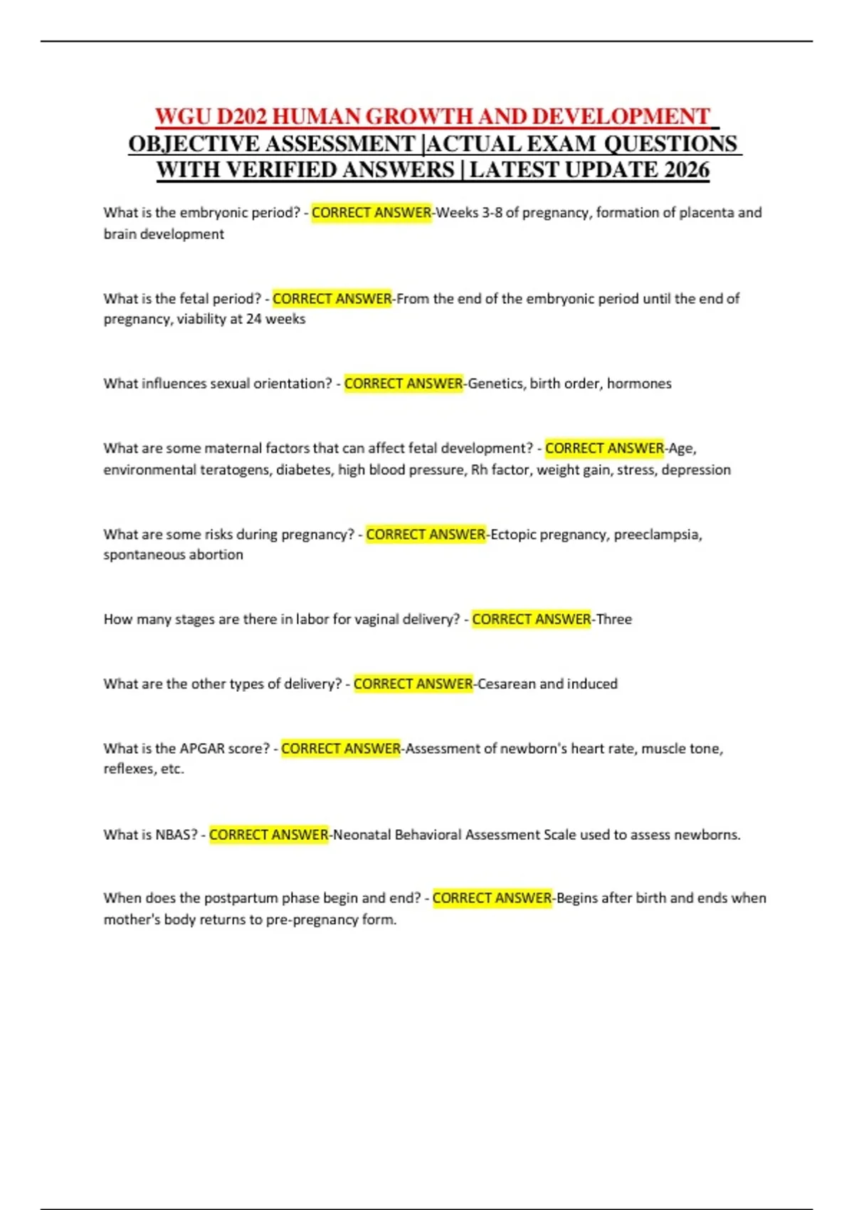 the complete set of actual WGU D202 Human Growth and Development objective-assessment questions with verified correct answers. It covers prenatal development, genetics, infancy, childhood, adolescence, adulthood, aging, cognition, psychosocial theories, sexuality, parenting, stress, and end-of-life material. The content is aligned with the latest 2026 exam updates and provides comprehensive preparation for the full course assessment.