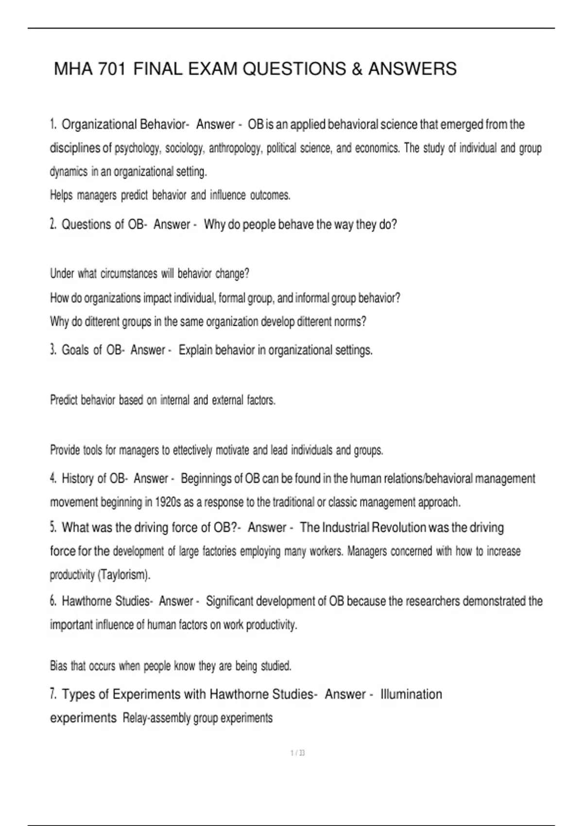MHA 701 FINAL EXAM QUESTIONS & ANSWERS