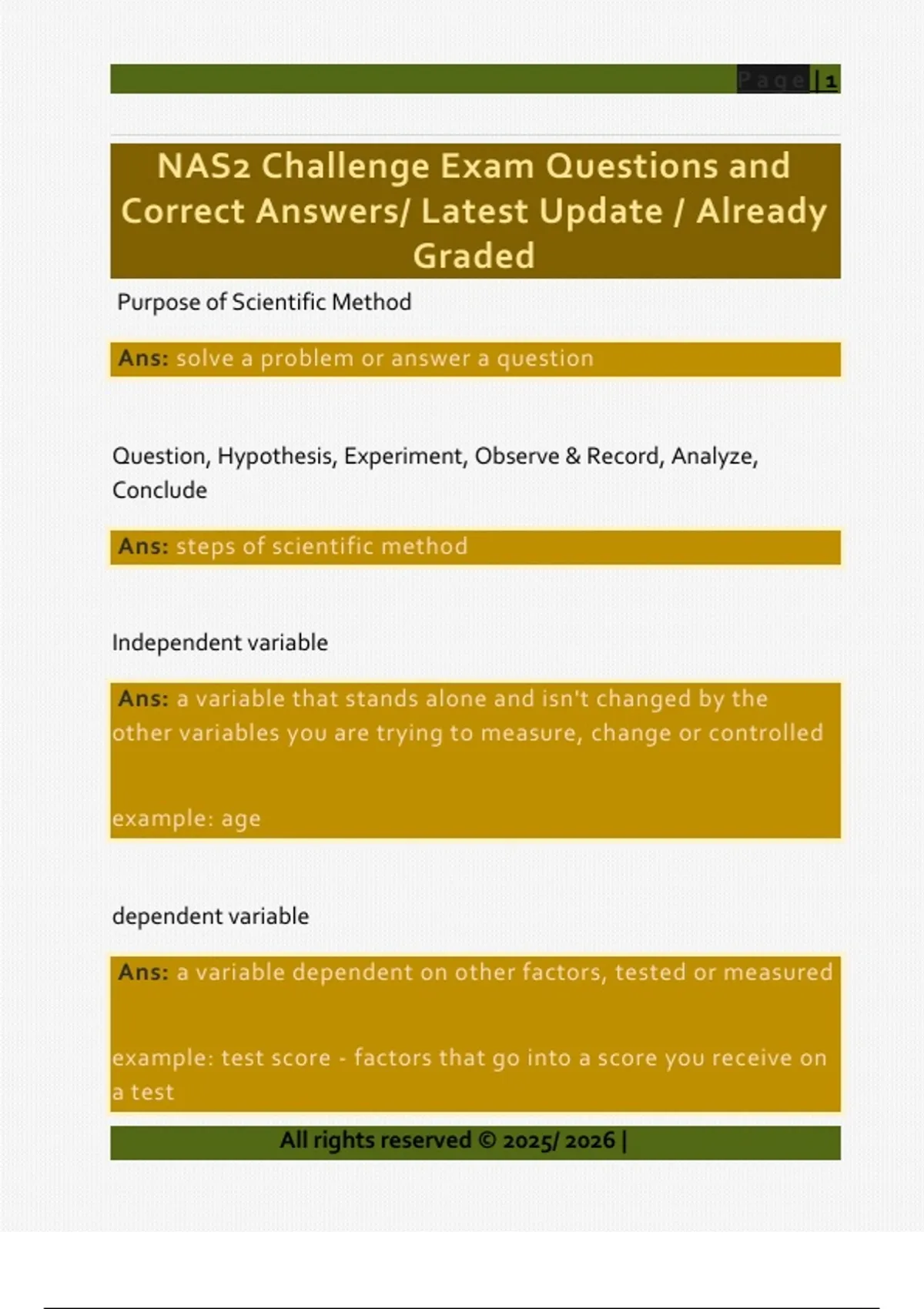 Purpose of Scientific Method Ans: solve a problem or answer a question Question, Hypothesis, Experiment, Observe & Record, Analyze, Conclude Ans: steps of scientific method Independent variable Ans: a variable that stands alone and isn't changed by the other variables you are trying to measure, change or controlled example: age dependent variable Ans: a variable dependent on other factors, tested or measured example: test score - factors that go into a score you receive on a test Page | 2 All rights reserved © 2025/ 2026 | control group Ans: does not receive treatment and used to compare or measure the other subjects experimental group Ans: exposed to changes in independent variable anatomy Ans: branch of science concerned with bodily structure of living organisms; structure physiology Ans: science dealing with the functions of living things or their organs level of organization Ans: living things arranged from the simplest to most complex are: organelle cells Page | 3 All rights reserved © 2025/ 2026 | tissues organs organ systems, organism populations communities ecosystem biosphere requirements for life Ans: Cellular organization Reproduction Metabolism Homeostasis Heredity Response to stimuli Growth and development Adaptation through evolu