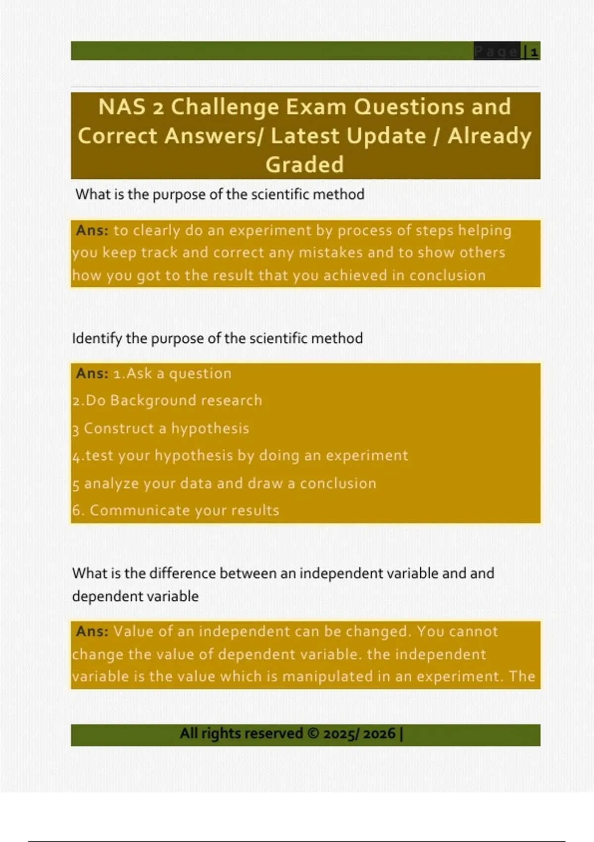 What is the purpose of the scientific method Ans: to clearly do an experiment by process of steps helping you keep track and correct any mistakes and to show others how you got to the result that you achieved in conclusion Identify the purpose of the scientific method Ans: 1.Ask a question 2.Do Background research 3 Construct a hypothesis your hypothesis by doing an experiment 5 analyze your data and draw a conclusion 6. Communicate your results What is the difference between an independent variable and and dependent variable Ans: Value of an independent can be changed. You cannot change the value of dependent variable. the independent variable is the value which is manipulated in an experiment. The Page | 2 All rights reserved © 2025/ 2026 | dependent variable is compared to the control group, which does not recieve the test variable Anatomy Ans: The study of structure and shape of the body and its parts and relation to one another Physiology Ans: Study of how the body and its parts work or function Six Levels of organization Ans: 1. Chemicals (atoms and molecules) 2. Cellular 3. Tissue 4. Organ 5. Organ system 6. Organismal Identify Requirements for Life