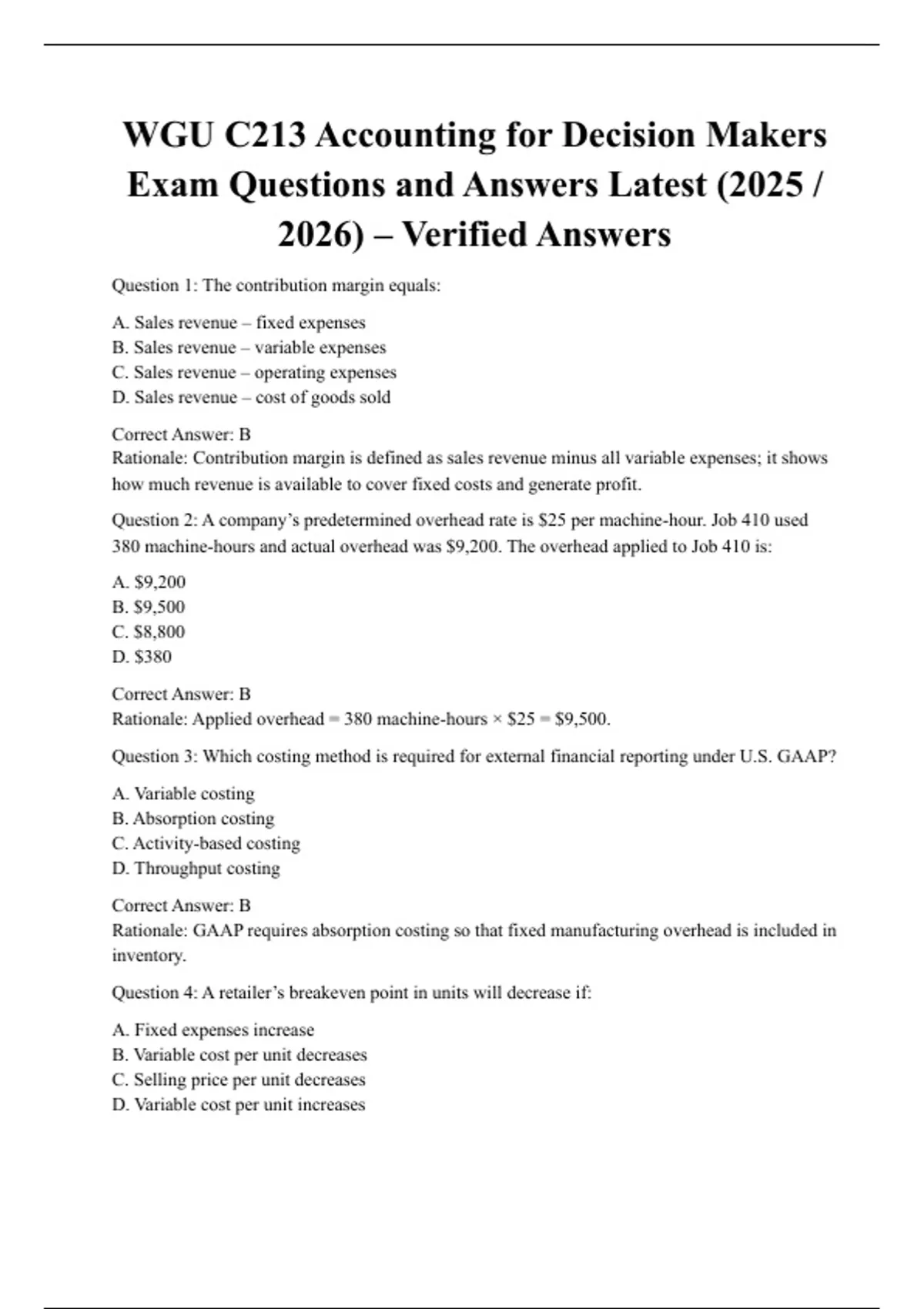 his document provides an updated 2025–2026 practice exam review for WGU C213 Accounting for Decision Makers, featuring realistic practice-style questions with fully explained and verified answers. It covers key C213 topics such as financial statements, budgeting, cost behavior, managerial decision-making, variance analysis, and financial ratio interpretation. Designed to support strong preparation for course assessments, this resource helps learners understand core accounting concepts and apply them successfully in decision-making scenarios.