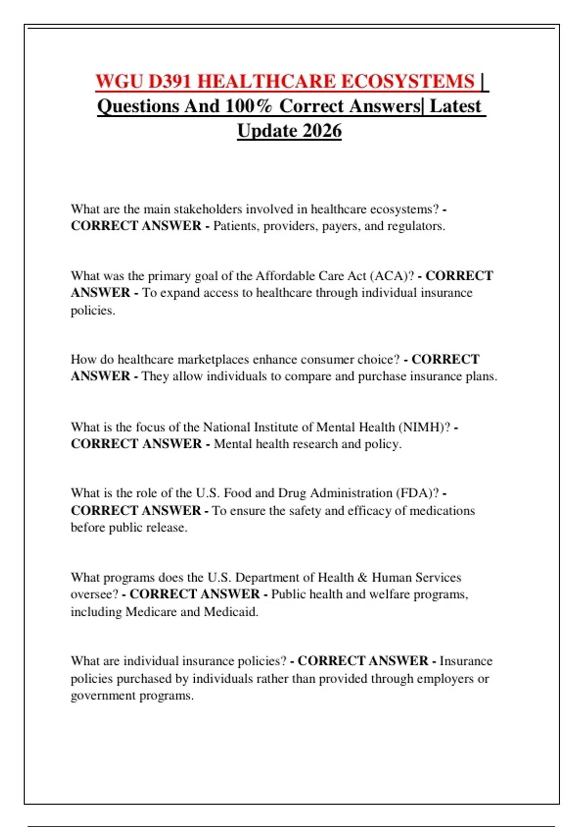 a complete and updated collection of exam questions and verified answers for the WGU D391 Healthcare Ecosystems course. It covers core concepts including healthcare stakeholders, ACA reforms, insurance models, quality frameworks, provider roles, decision-making models, and federal regulations. The content is structured to support efficient study and thorough preparation for the objective assessment, reflecting the latest exam updates.