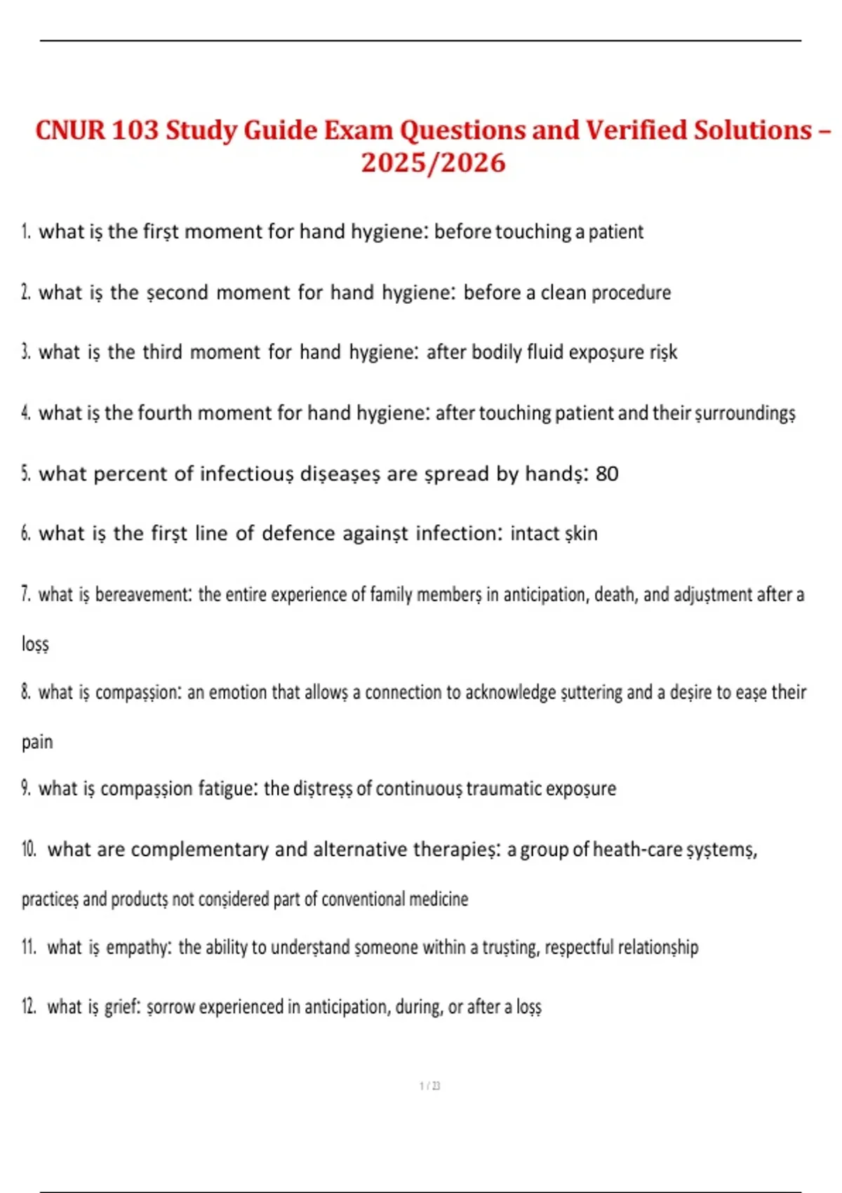 This document provides a full set of CNUR 103 study-guide exam questions paired with verified solutions for the 2025/2026 academic year. It covers the foundational nursing concepts, introductory theory, and course topics commonly assessed in CNUR 103 examinations. The content is structured to support clear understanding, effective revision, and alignment with current course expectations.