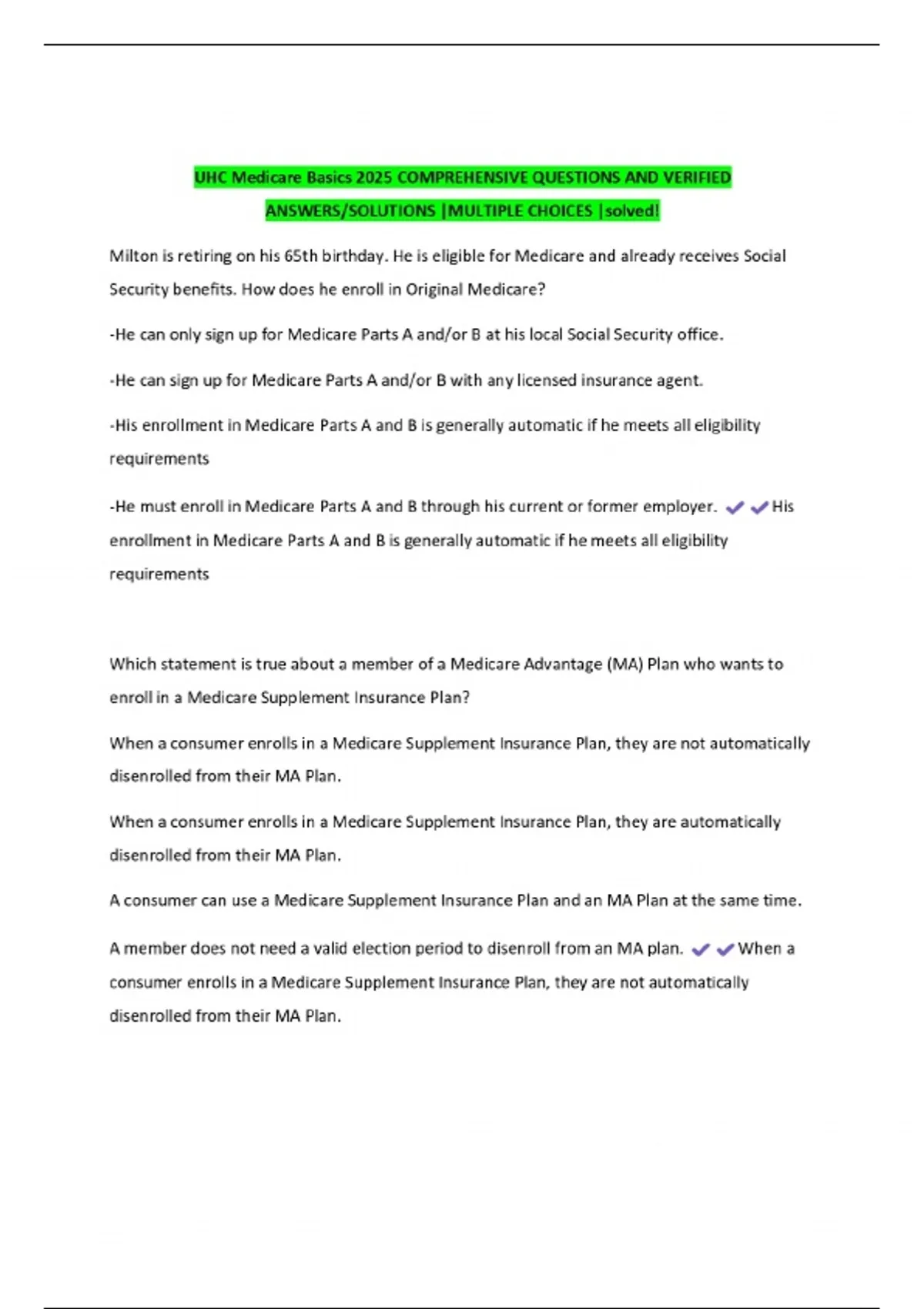 UHC Medicare Basics 2025 COMPREHENSIVE QUESTIONS AND VERIFIED ANSWERS/SOLUTIONS |MULTIPLE CHOICES |solved!