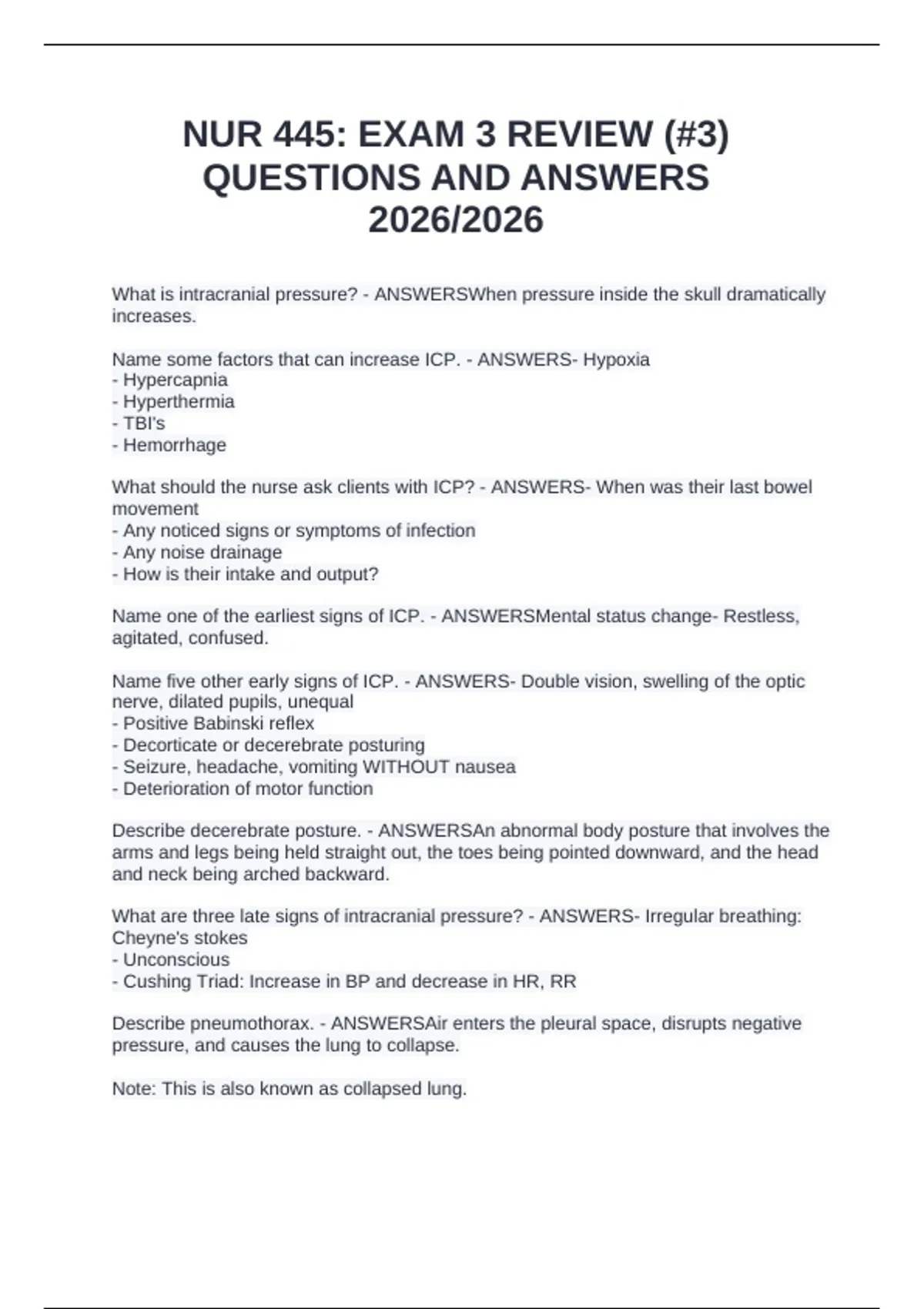 NUR 445: EXAM 3 REVIEW (#3) QUESTIONS AND ANSWERS 2026/2026