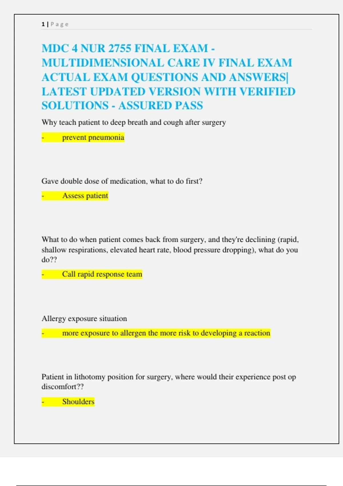 MDC 4 NUR 2755 FINAL EXAM - MULTIDIMENSIONAL CARE IV FINAL EXAM ACTUAL EXAM QUESTIONS AND ANSWERS| LATEST UPDATED VERSION WITH VERIFIED SOLUTIONS - ASSURED PASS