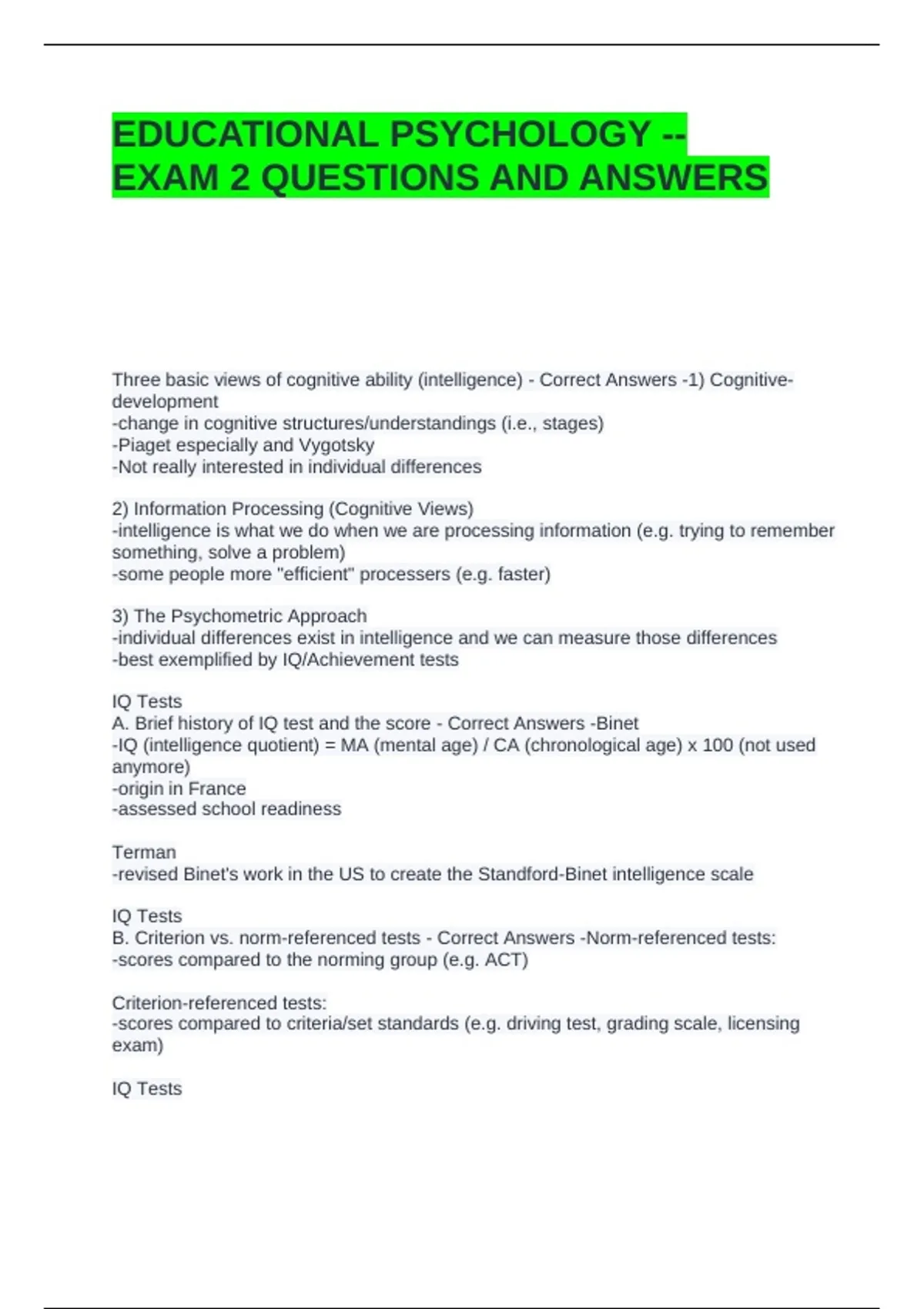 EDUCATIONAL PSYCHOLOGY -- EXAM 2 QUESTIONS AND ANSWERS