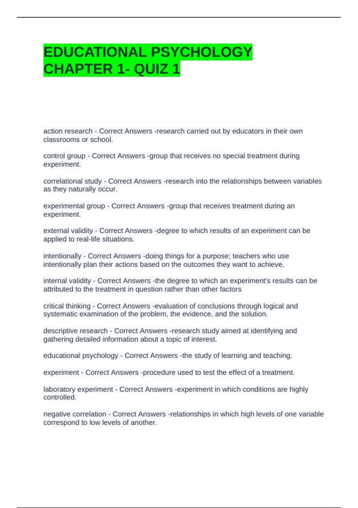 EDUCATIONAL PSYCHOLOGY CHAPTER 1- QUIZ 1 WITH VERIFIED ANSWERS | GRADED A