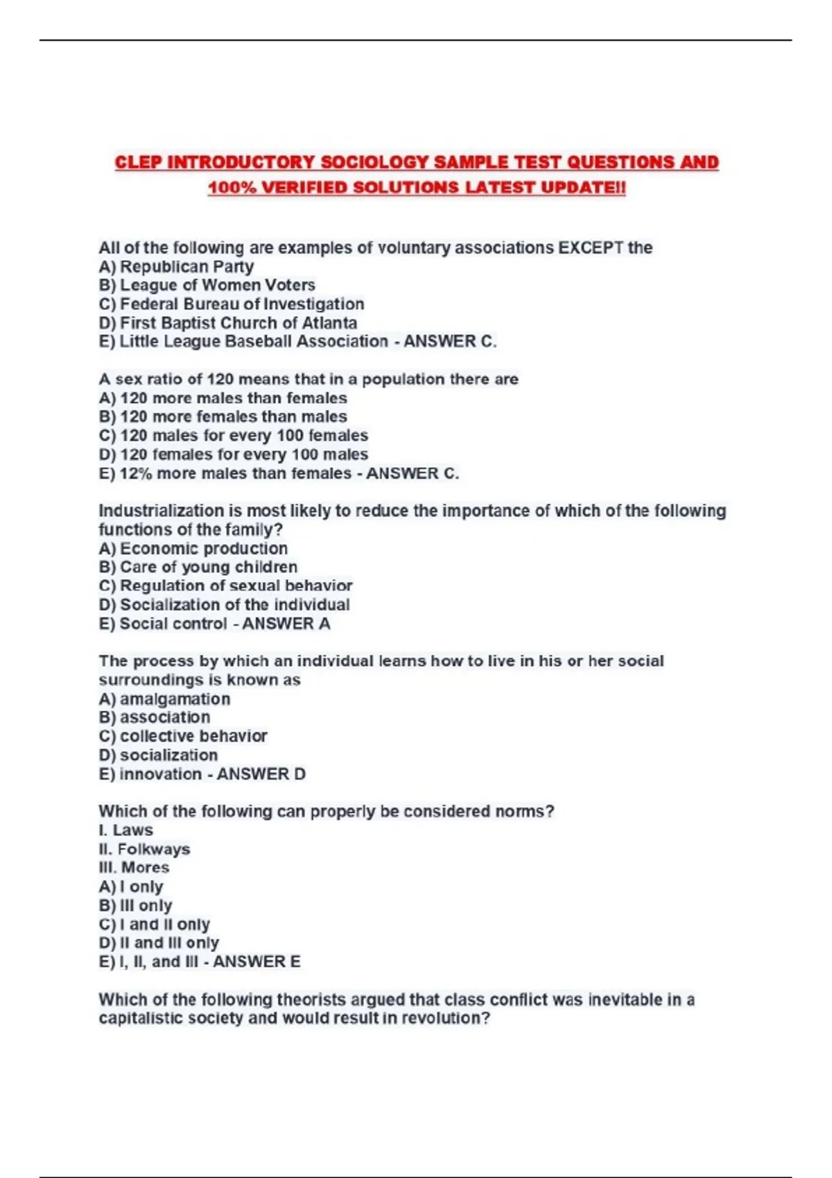 CLEP INTRODUCTORY SOCIOLOGY SAMPLE TEST QUESTIONS AND 100% VERIFIED SOLUTIONS LATEST UPDATE!!...