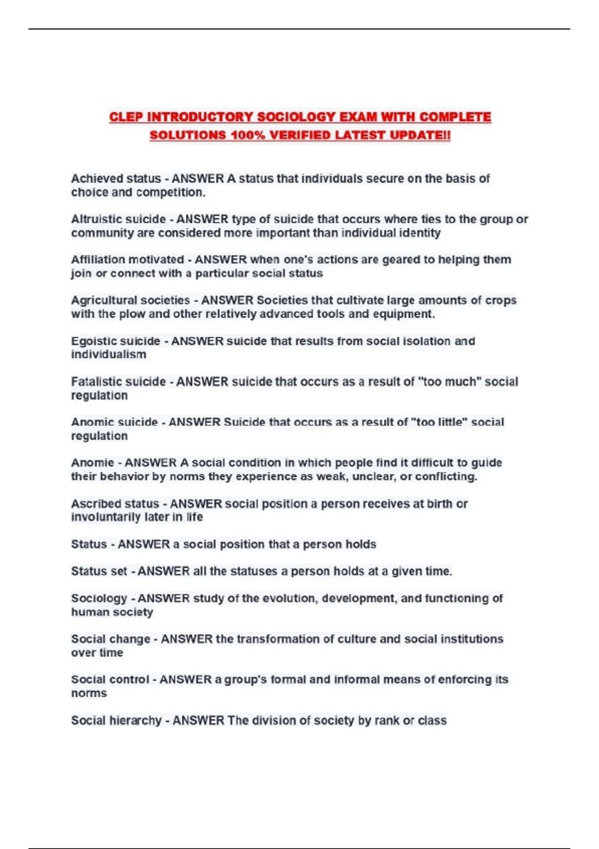 CLEP INTRODUCTORY SOCIOLOGY EXAM WITH COMPLETE SOLUTIONS 100% VERIFIED LATEST UPDATE!!...