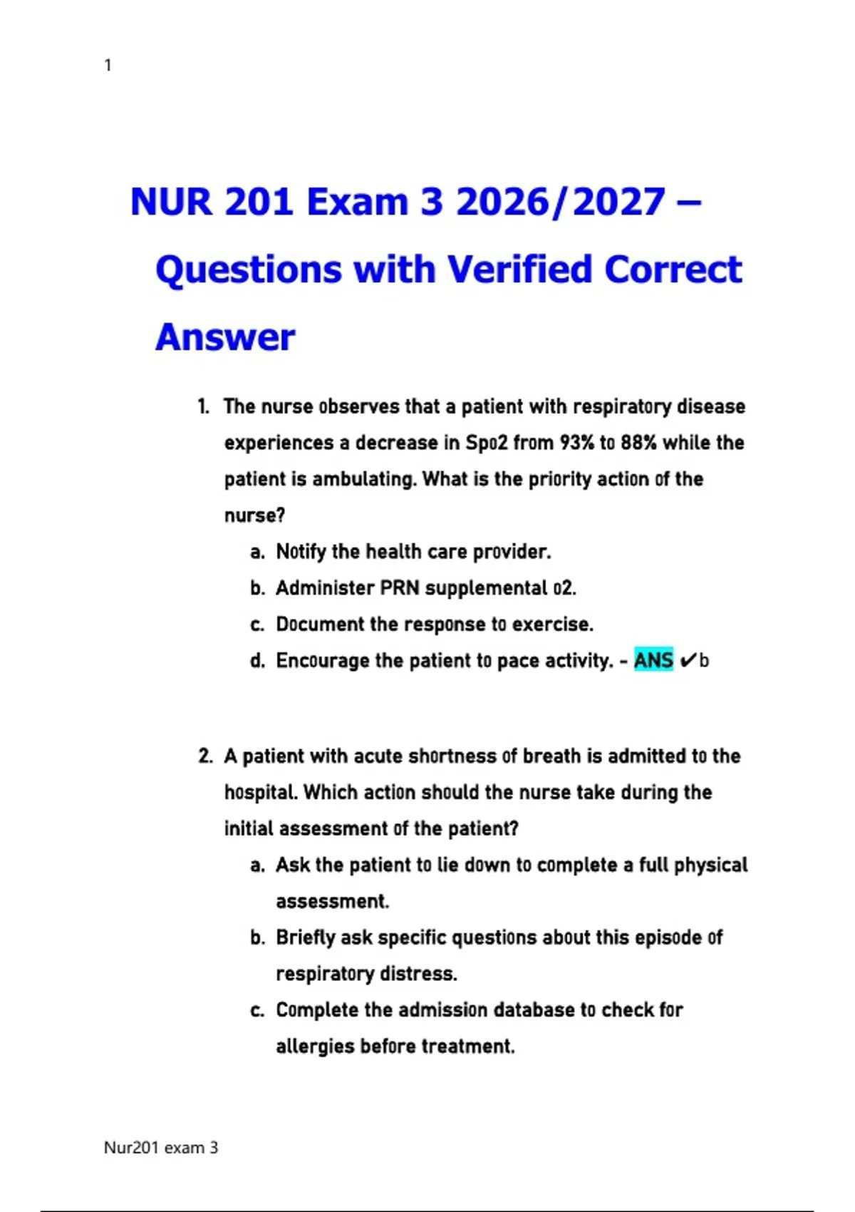 NUR 201 Exam 3 2026/2027 –