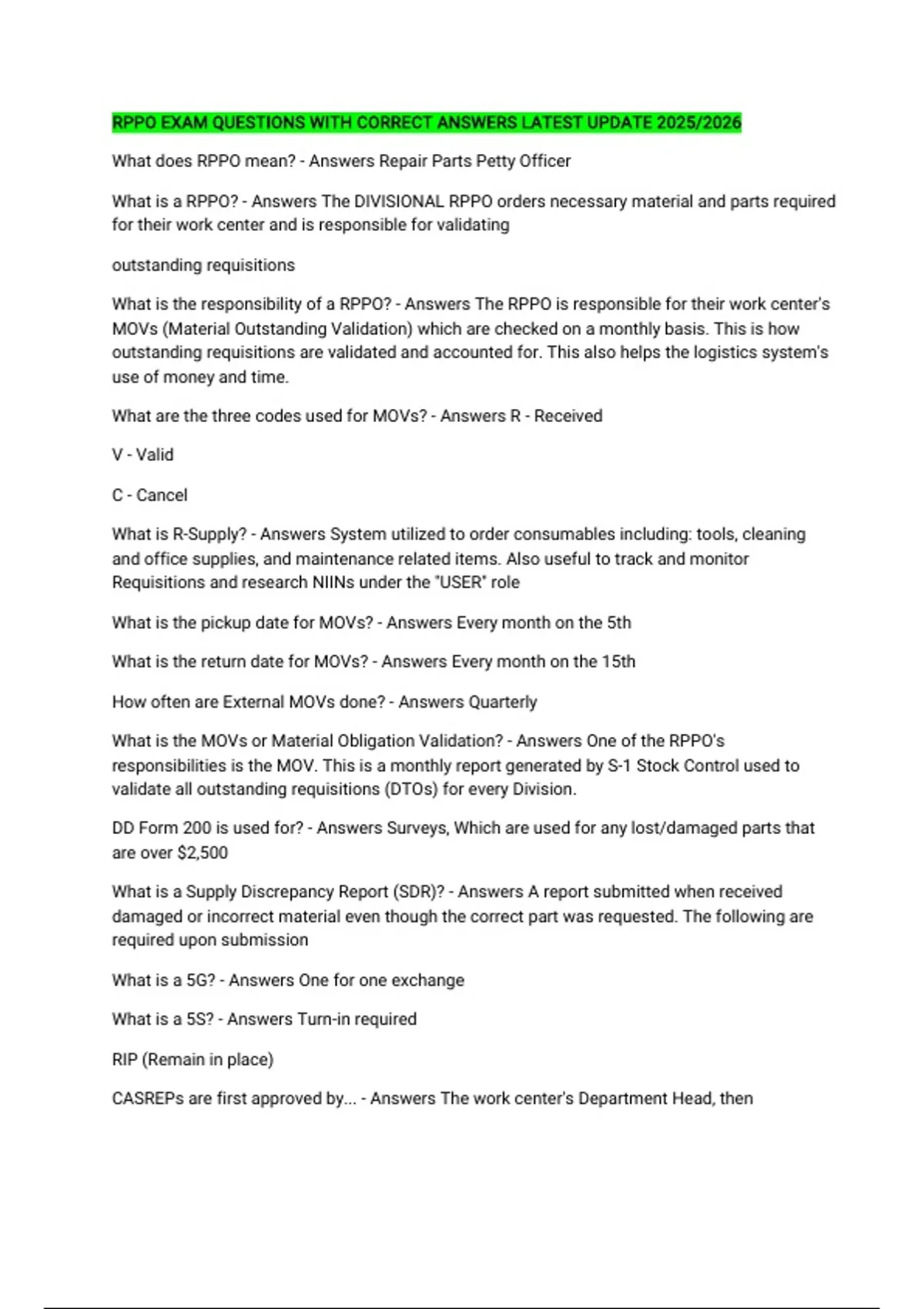 RPPO EXAM QUESTIONS WITH CORRECT ANSWERS LATEST UPDATE 2025/2026 What does RPPO mean? - Answers Repair Parts Petty Officer What is a RPPO? - Answers The DIVISIONAL RPPO orders necessary material and parts required for their work center and is responsible for validating outstanding requisitions What is the responsibility of a RPPO? - Answers The RPPO is responsible for their work center's MOVs (Material Outstanding Validation) which are checked on a monthly basis. This is how outstanding requisitions are validated and accounted for. This also helps the logistics system's use of money and time. What are the three codes used for MOVs? - Answers R - Received V - Valid C - Cancel What is R-Supply? - Answers System utilized to order consumables including: tools, cleaning and office supplies, and maintenance related items. Also useful to track and monitor Requisitions and research NIINs under the "USER" role What is the pickup date for MOVs? - Answers Every month on the 5th What is the return date for MOVs? - Answers Every month on the 15th How often are External MOVs done? - Answers Quarterly What is the MOVs or Material Obligation Validation? - Answers One of the RPPO's responsibilities is the MOV. This is a monthly report generated by S-1 Stock Control used to validate all outstanding requisitions (DTOs) for every Division. DD Form 200 is used for? - Answers Surveys, Which are used for any lost/damaged parts that are over $2,500 What is a Supply Discrepancy Report (SDR)? - Answers A report submitted when received damaged or incorrect material even though the correct part was requested. The following are required upon submission What is a 5G? - Answers One for one exchange What is a 5S? - Answers Turn-in required RIP (Remain in place) CASREPs are first approved by... - Answers The work center's Department Head, then