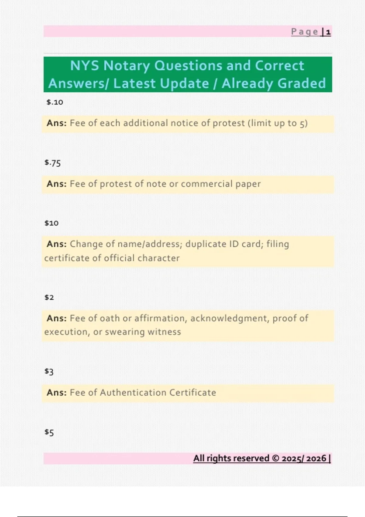 $.10 Ans: Fee of each additional notice of protest (limit up to 5) $.75 Ans: Fee of protest of note or commercial paper $10 Ans: Change of name/address; duplicate ID card; filing certificate of official character $2 Ans: Fee of oath or affirmation, acknowledgment, proof of execution, or swearing witness $3 Ans: Fee of Authentication Certificate $5 All rights reserved © 2025/ 2026 | Page | 2 Ans: Issuance of Certificate of Official Character $60 Ans: Appointment as NP Fee 1 year Ans: Maximum term for Class A misdemeanor 15 years Ans: Maximum term for Class C felony 25 years Ans: Maximum term for Class B felony 4 years Ans: Maximum term for Class E felony 6 months Ans: Maximum term for Class B misdemeanor All rights reserved © 2025/ 2026 | Page | 3 7 years Ans: Maximum term for Class D felony Acknowledgment Ans: A form