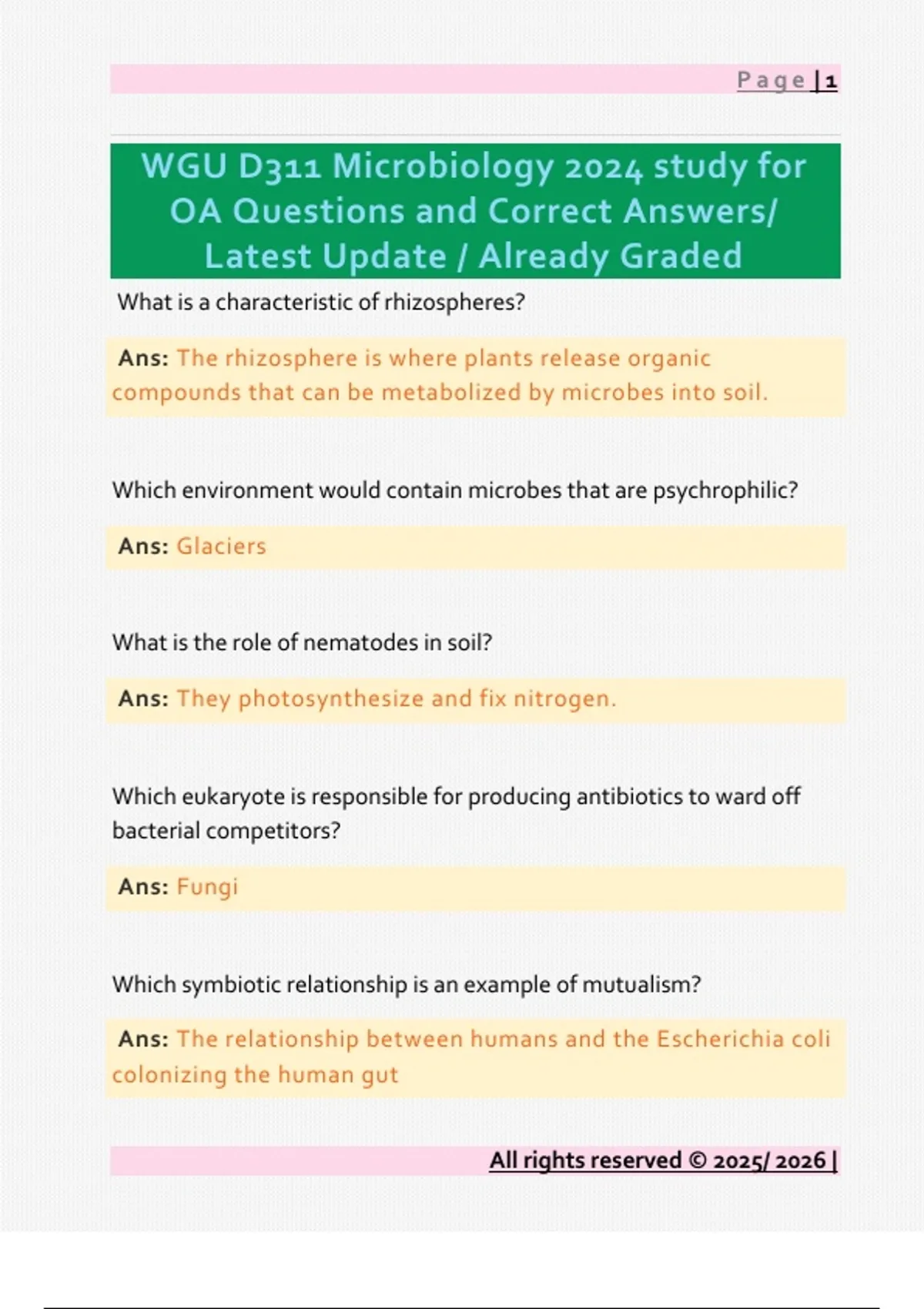 WGU D311 Microbiology 2024 study for OA Questions and Correct Answers/ Latest Update / Already Graded