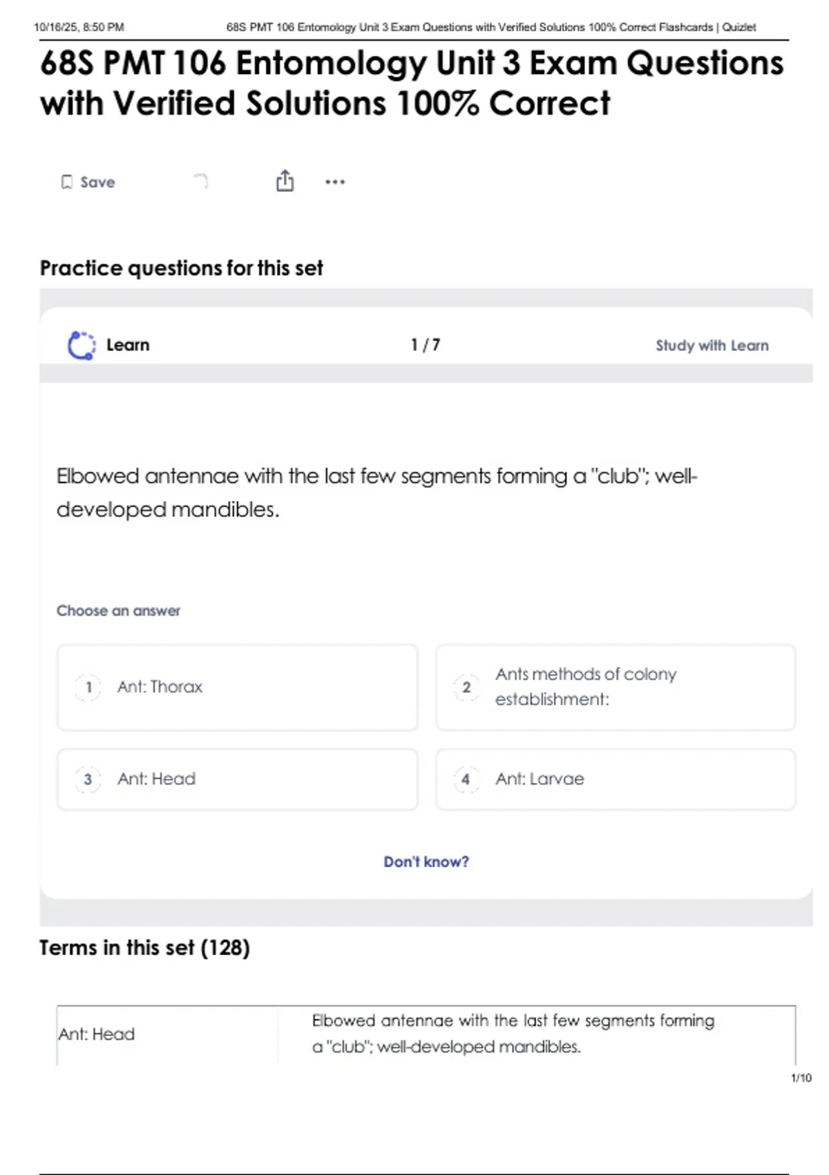 , 10/16/25, 8:50 PM 68S PMT 106 Entomology Unit 3 Exam Questions with Verified Solutions 100% Correct Flashcards | Quizlet