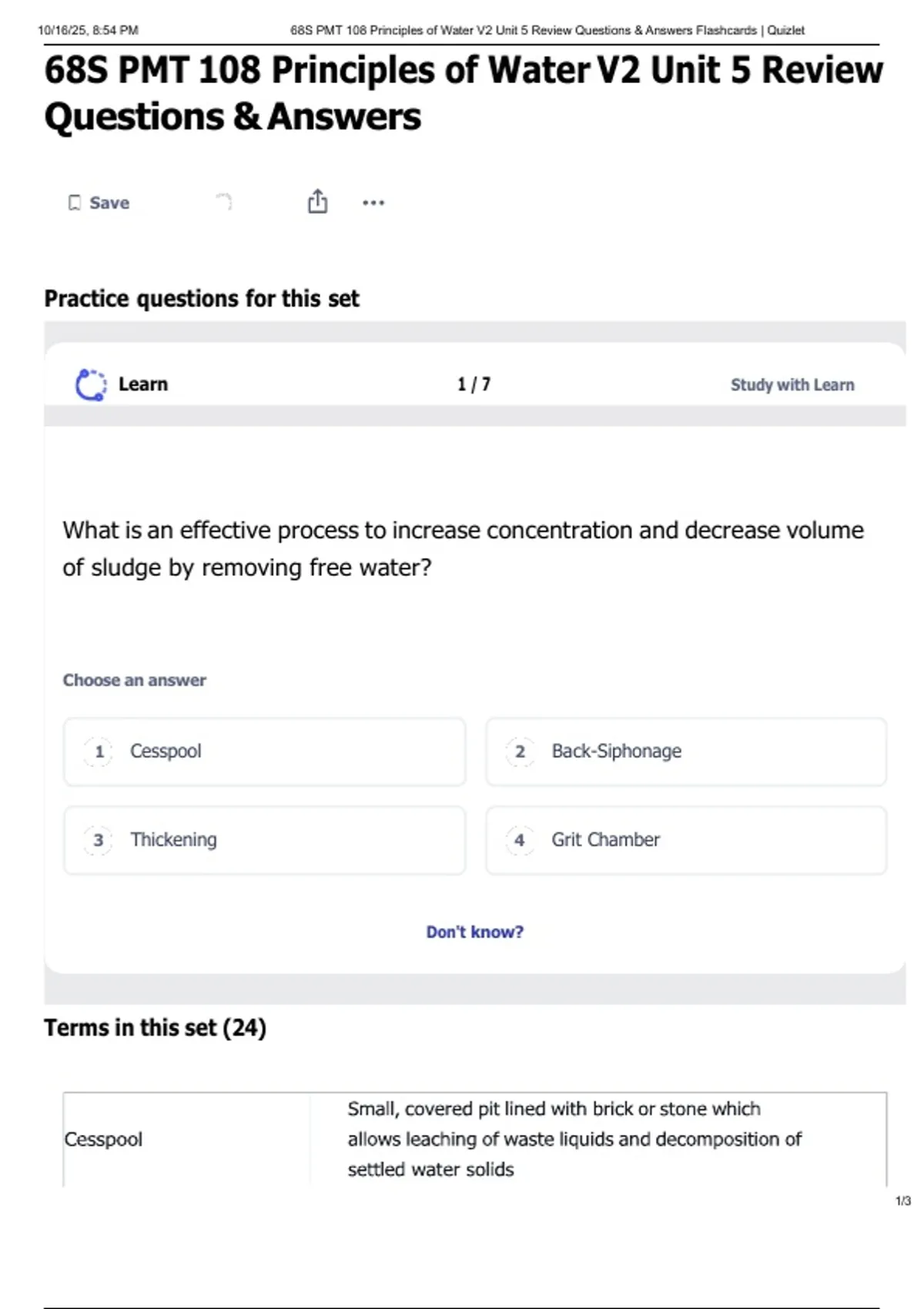 10/16/25, 8:54 PM 68S PMT 108 Principles of Water V2 Unit 5 Review Questions & Answers Flashcards | Quizlet