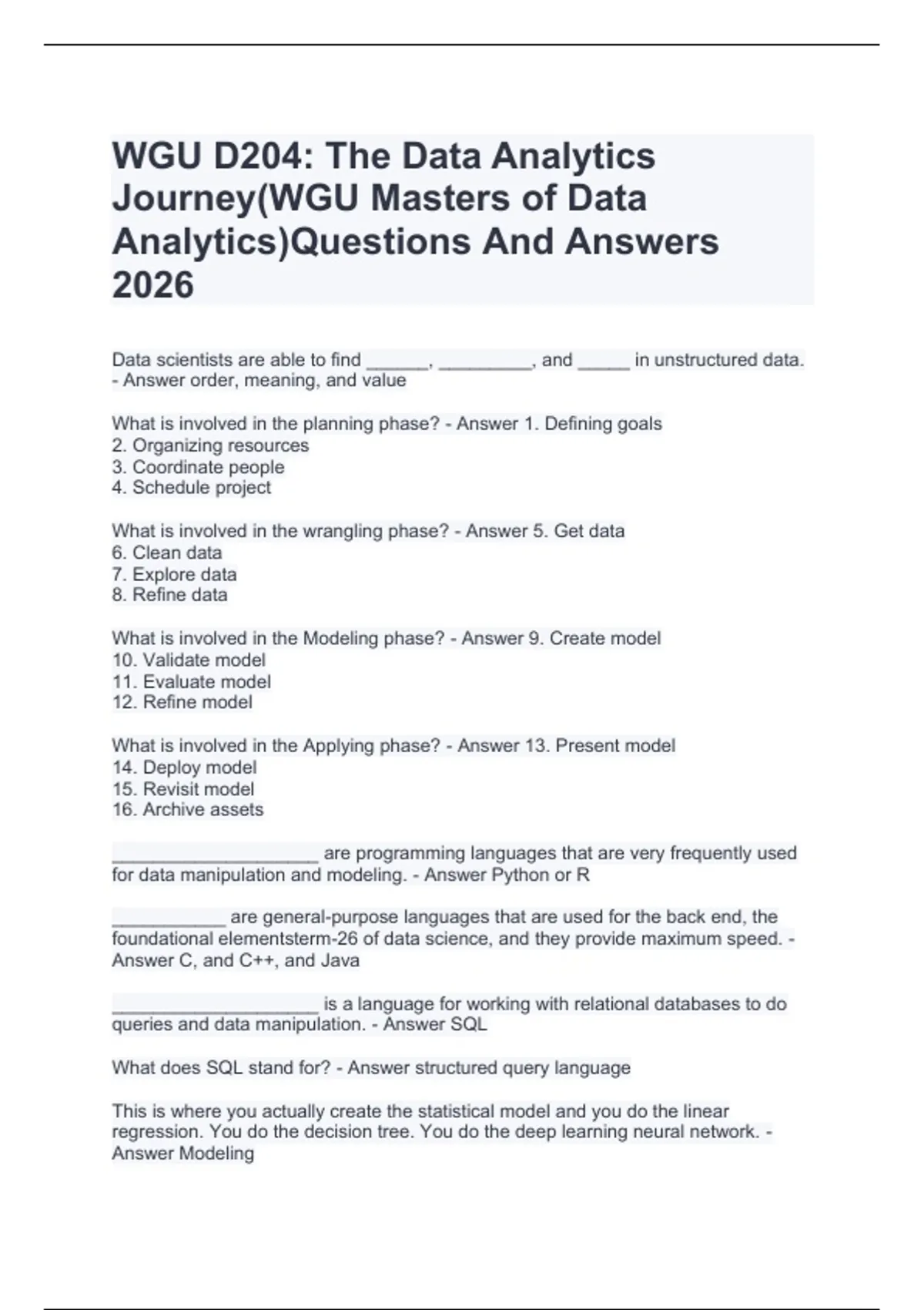 This document contains a complete set of questions and answers aligned with the 2026 version of WGU’s D204 “The Data Analytics Journey,” part of the Master of Data Analytics program. It covers core concepts such as analytics lifecycle stages, business understanding, data preparation, modeling techniques, evaluation, communication of insights, and ethical considerations. The material reflects the updated D204 curriculum and supports students preparing for assessments by offering clear, structured, and correct responses.