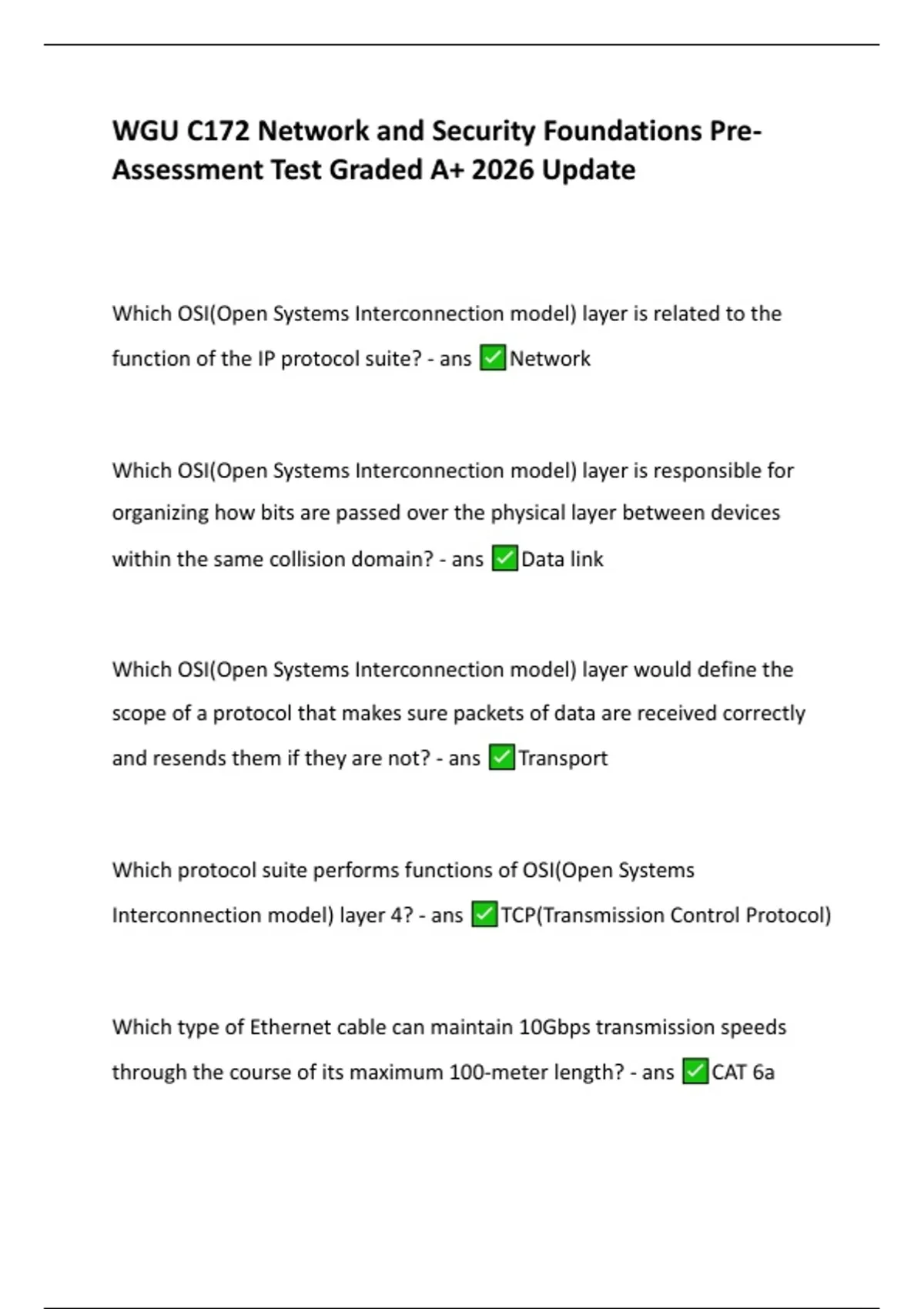 his document contains the fully updated 2026 Pre-Assessment test for WGU’s C172 Network and Security Foundations course, complete with correct answers. It covers core networking fundamentals, including the OSI and TCP/IP models, IP addressing, subnetting, routing, switching, wireless networking, security controls, protocols, and troubleshooting principles. The material is designed for students preparing for the C172 Objective Assessment and reflects the most recent curriculum updates.