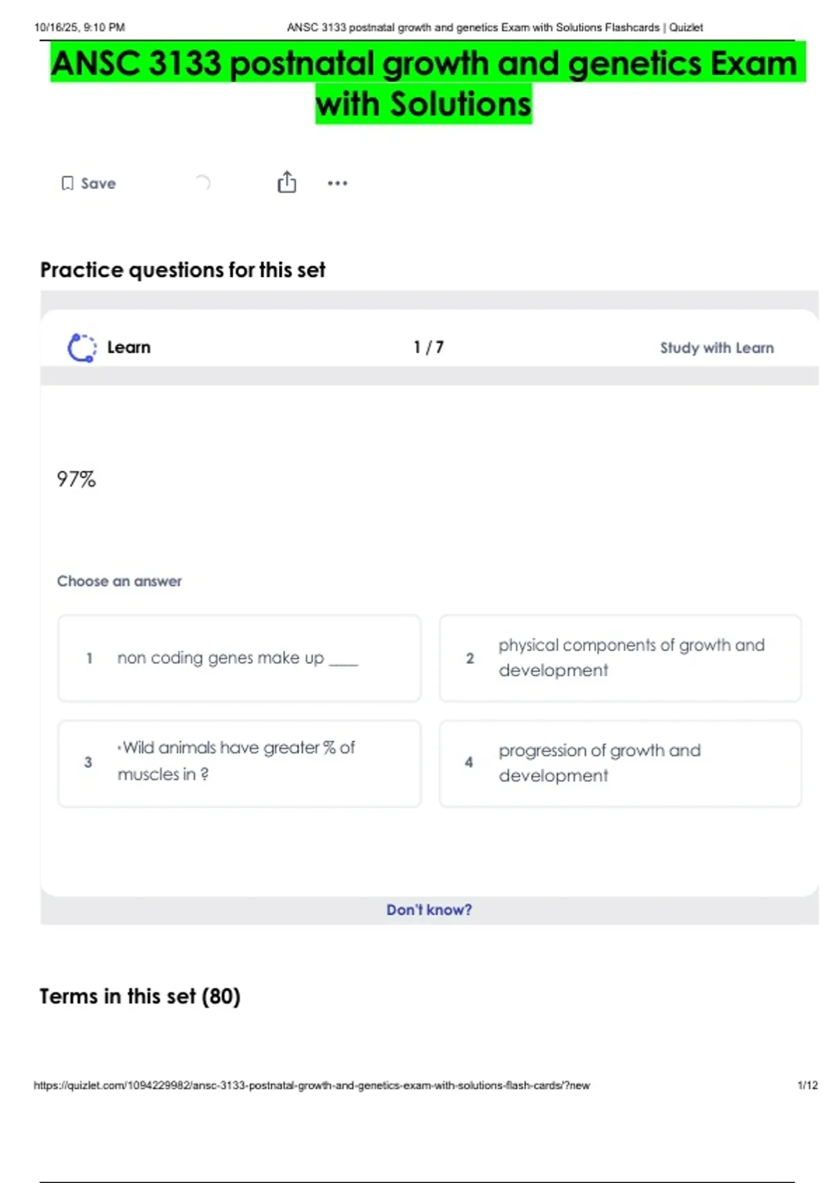 , 10/16/25, 9:10 PM ANSC 3133 postnatal growth and genetics Exam with Solutions Flashcards | Quizlet