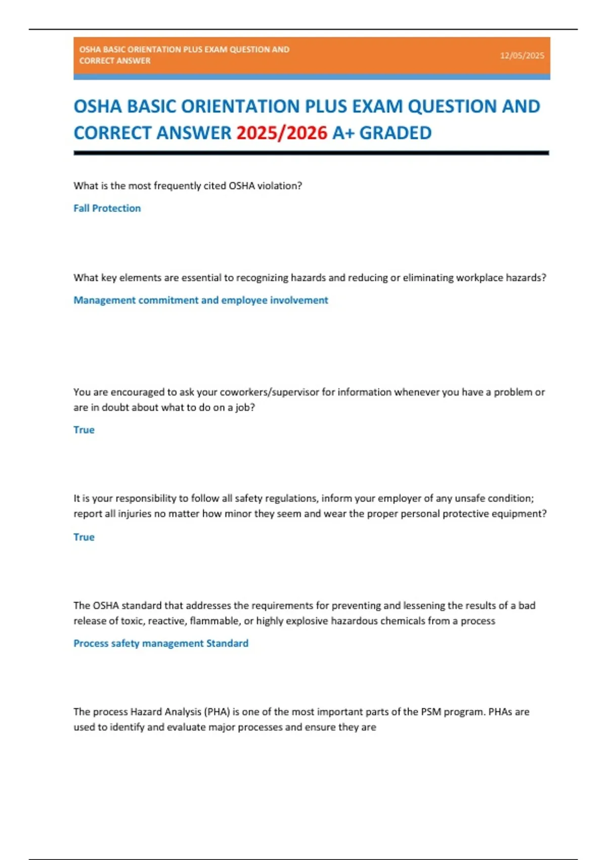 OSHA BASIC ORIENTATION PLUS EXAM QUESTION AND CORRECT ANSWER 2025/2026 A+ GRADED What is the most frequently cited OSHA violation? Fall Protection What key elements are essential to recognizing hazards and reducing or eliminating workplace hazards? Management commitment and employee involvement