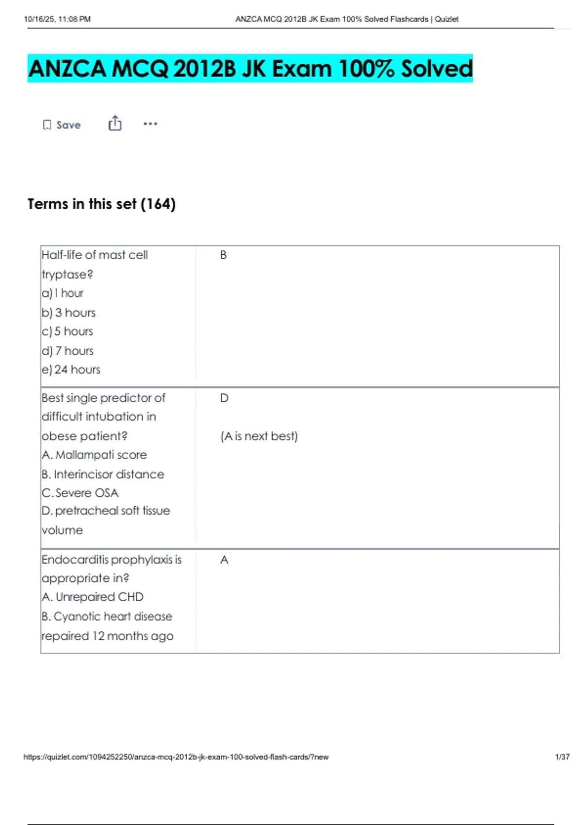 ,10/16/25, 11:08 PM ANZCA MCQ 2012B JK Exam 100% Solved Flashcards | Quizlet