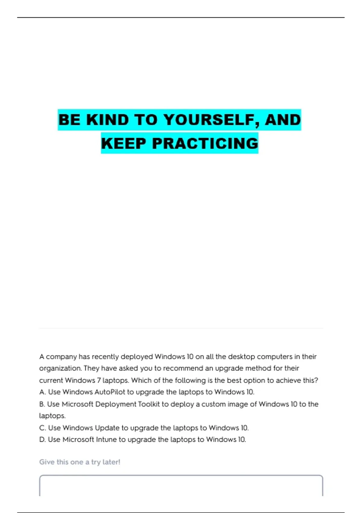 A. Use Windows AutoPilot to upgrade the laptops to Windows 10.