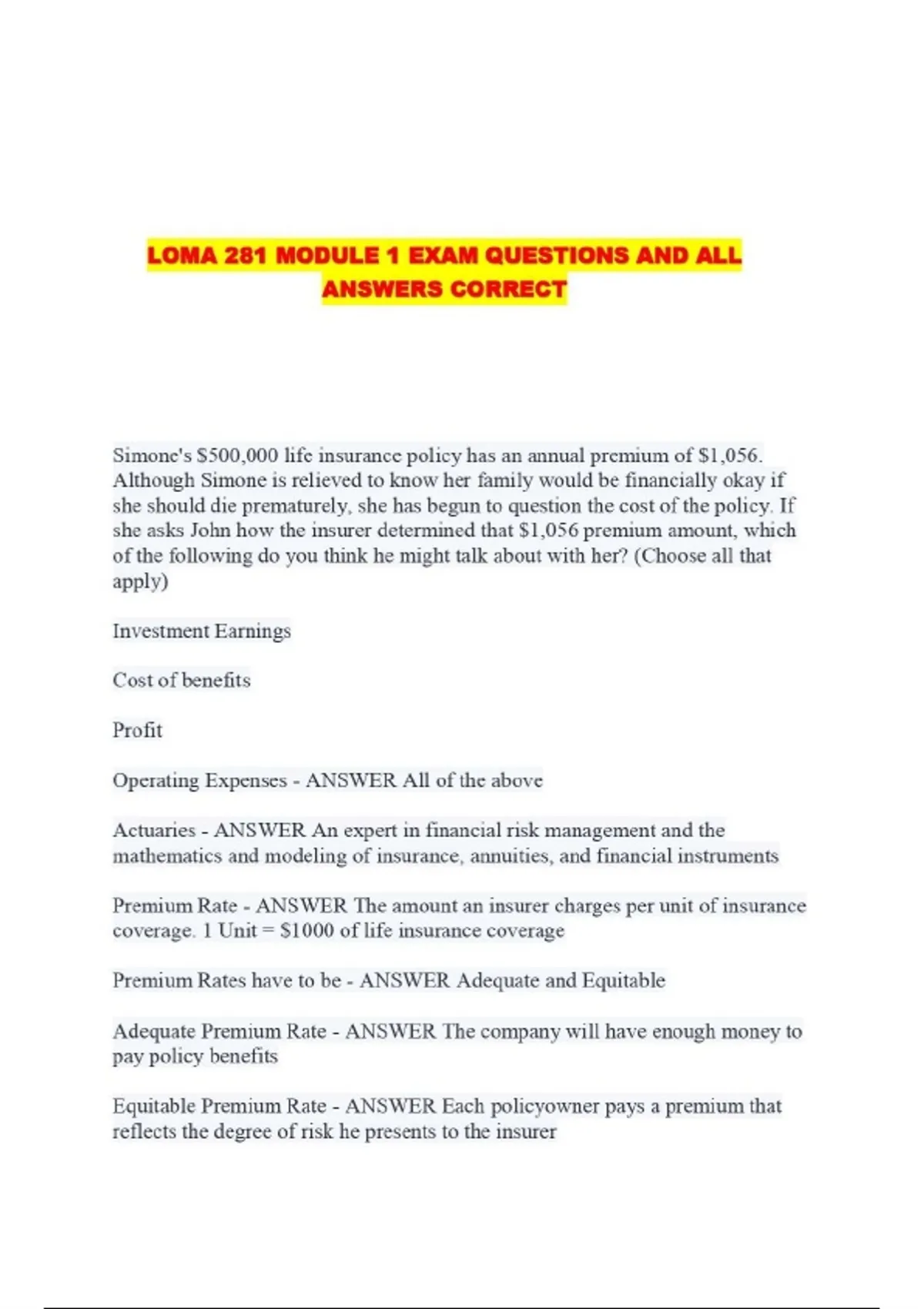 LOMA 281 MODULE 1 EXAM QUESTIONS AND ALL ANSWERS CORRECT....