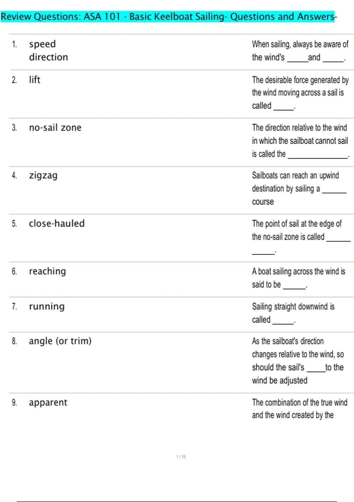 ,Review Questions: ASA 101 - Basic Keelboat Sailing- Questions and Answers