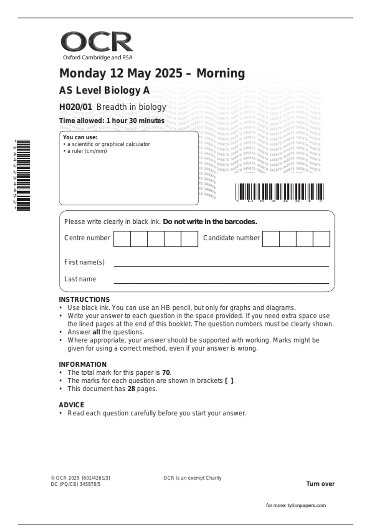 OCR AS LEVEL 2025 BIOLOGY A Paper 1 QP