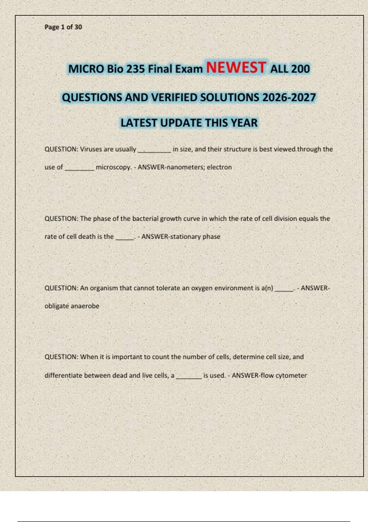 MICRO Bio 235 Final Exam NEWEST ALL 200 QUESTIONS AND VERIFIED SOLUTIONS LATEST UPDATE THIS YEAR