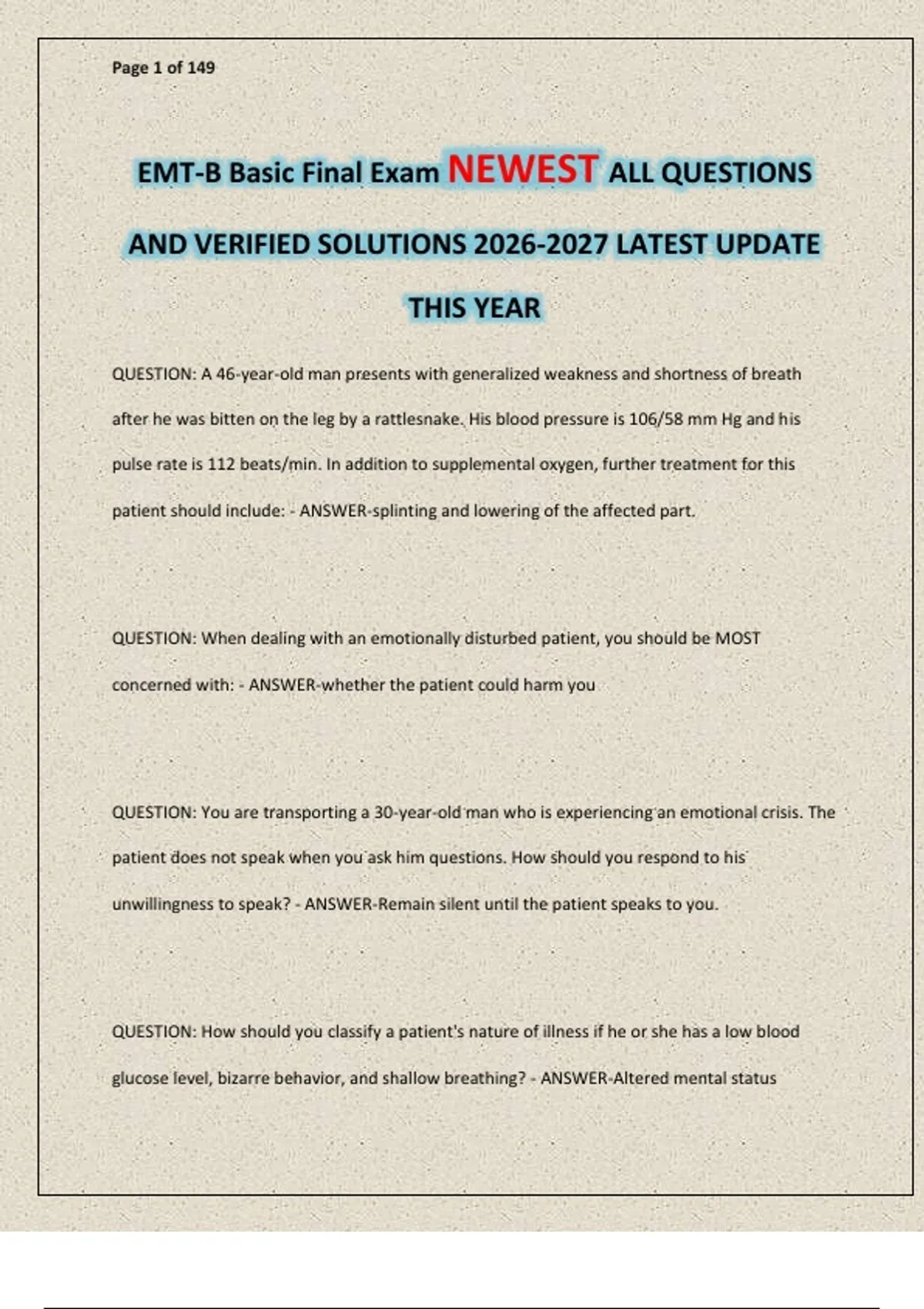 EMT-B Basic Final Exam NEWEST ALL QUESTIONS