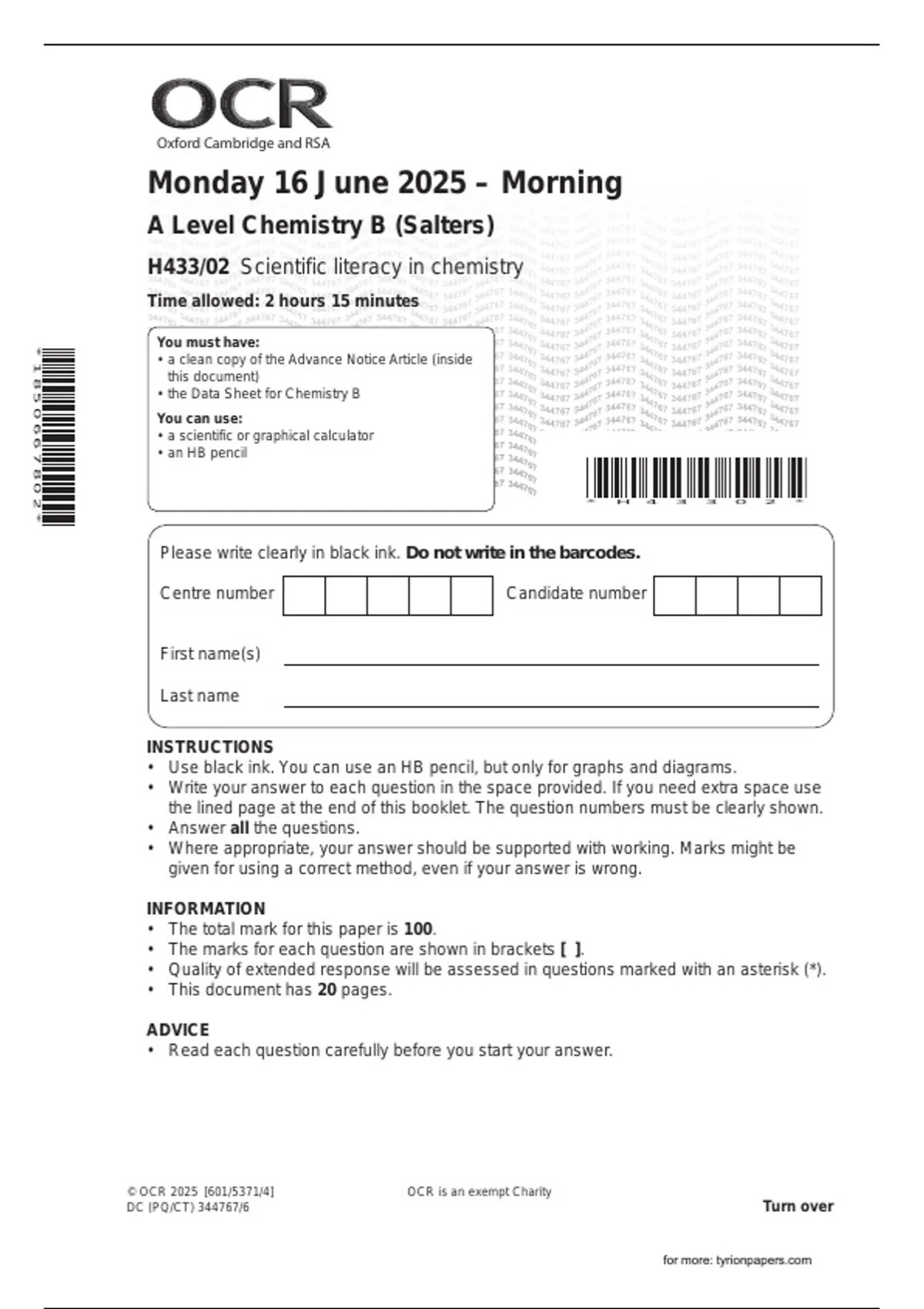 OCR A LEVEL 2025 CHEMISTRY B Paper 2 QP + free study guide at end