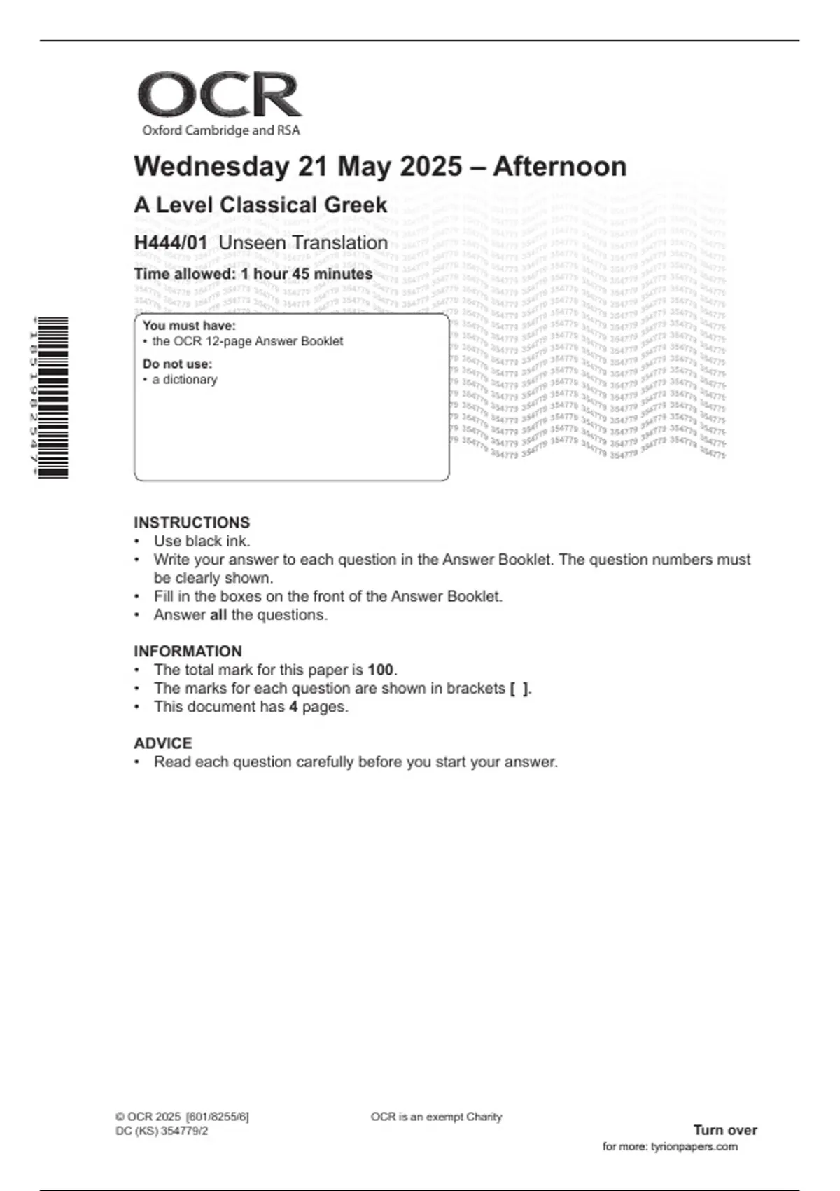 OCR A LEVEL 2025 CLASSICAL GREEK Paper 1 QP + free study guide at end