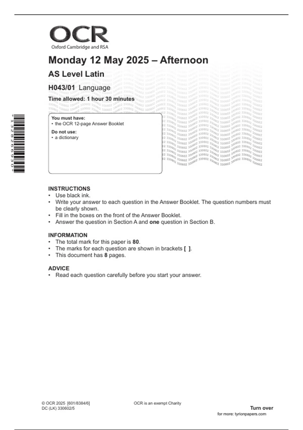 OCR AS LEVEL 2025 LATIN Paper 1 QP + free study guide at end